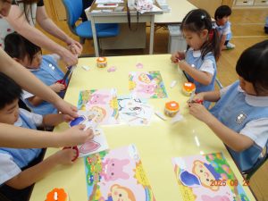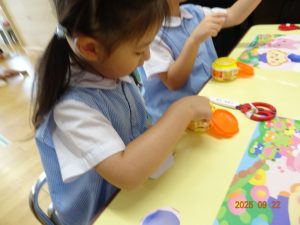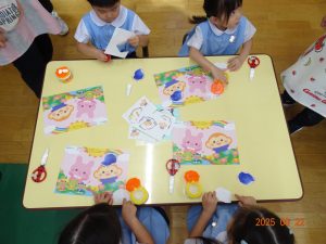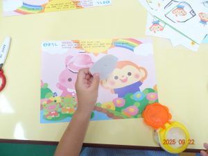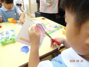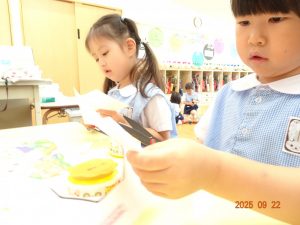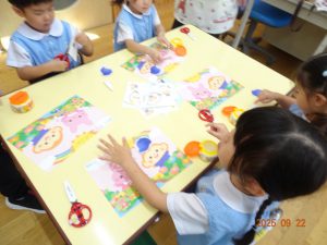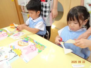 本日、令和7年9月22日(月)、3歳児クラスきく組のお製作の様子を覗いてみました。