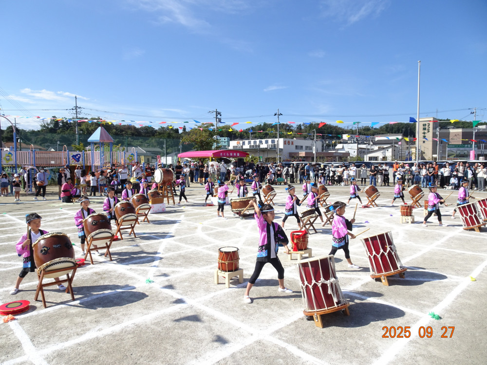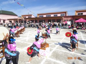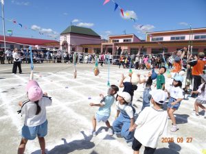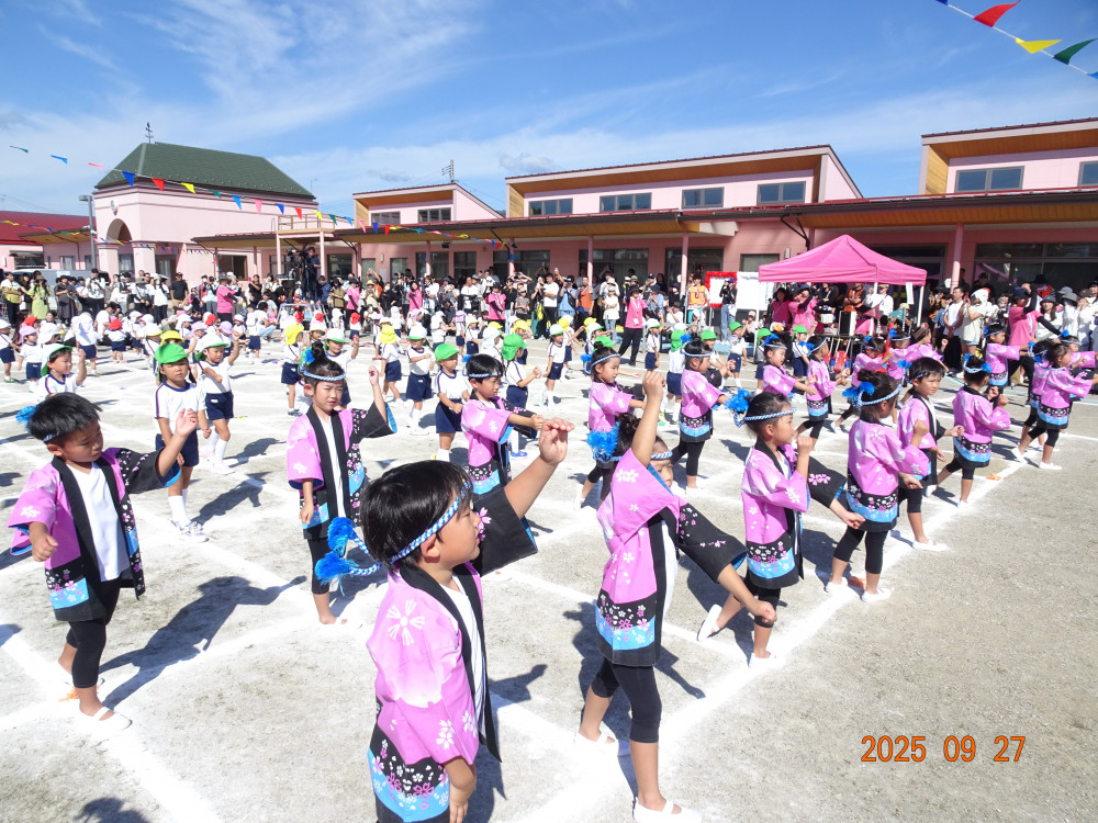 午前9時、打ち上げ花火と共に年長組ひまわり組のオープニング和太鼓で華々しく運動会が始まり、かけっこやダンスなど、子どもたちは練習の成果を十分に発揮し、一生懸命に走り、元気いっぱいに踊り、たくさんの拍手をいただきました。