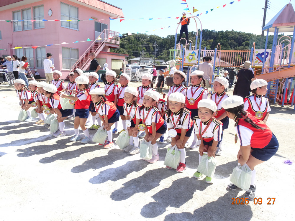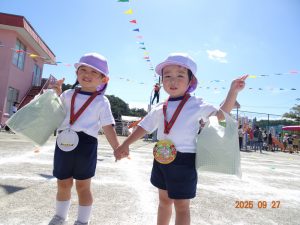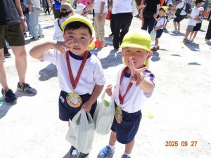 本日はお父さんお母さんおじいちゃんおばあちゃんお兄ちゃんお姉ちゃんに観ていただき、子どもたちは達成感と満足感に満ち溢れていると思います。参加賞の記念メダルをもらって嬉しそうです。本当によく頑張りました。たくさん褒めてあげてください。