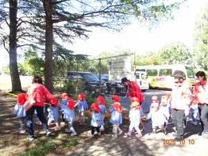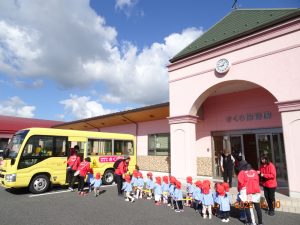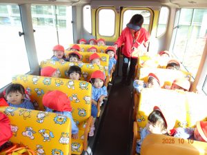 うめ組にとっては保育園生活で初めての園外活動で、子どもたちは初めての園バスでのお出かけに嬉しそう。