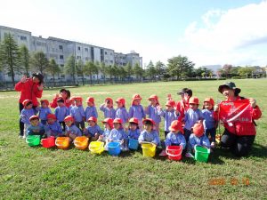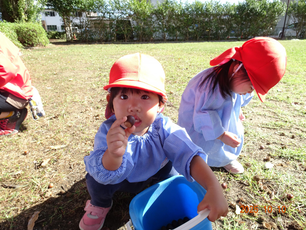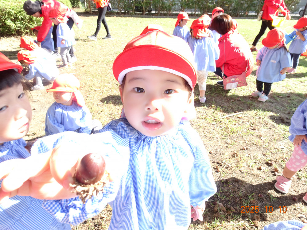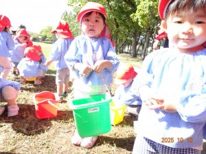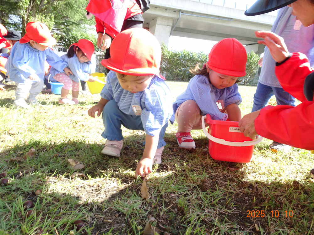 1歳児クラスうめ組の子どもたちに季節を感じ自然に触れさせることを目的として、本日、令和7年10月10日(金)、いわき市内郷御厩町の「天上田公園(てんじょうだこうえん)」「どんぐり拾い」に行ってきました。