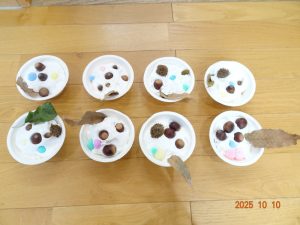 紙粘土と拾ってきたどんぐりや落ち葉を使って「どんぐりカップケーキ」を作りました。