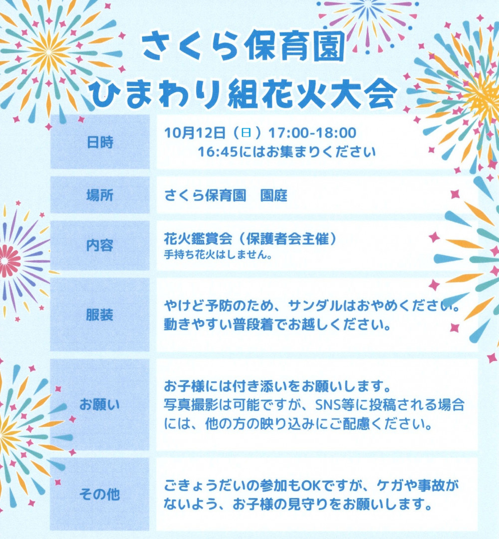 さくら保育園年長児ひまわり組保護者会がこの度「花火大会」を企画してくださり、本日、令和7年10月12日(日)に開催していただきました。