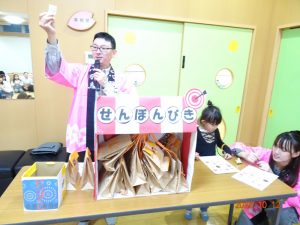 ビンゴになった順番に千本引きを引いて景品をゲット