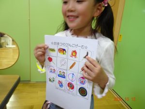はじめに多目的室に集まり、保護者会主導で「ビンゴ大会」を開催。