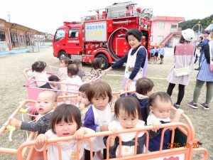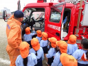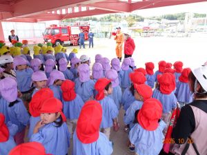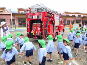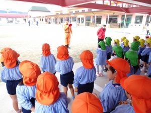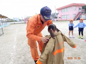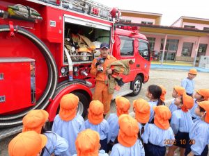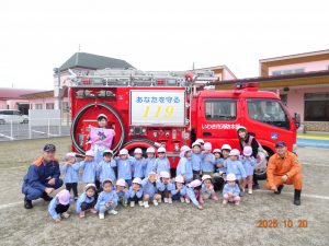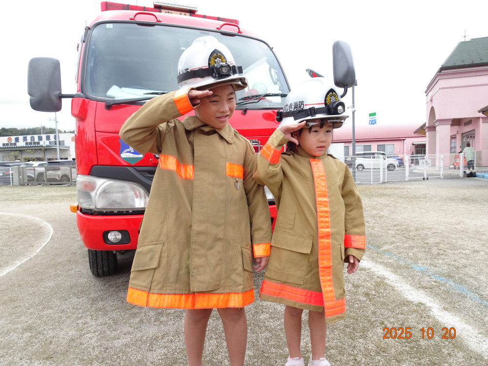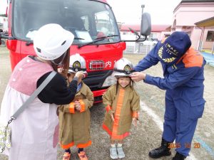 5歳児クラスひまわり組の子どもたちは、特別に「防火ヘルメット」と「防火服(子ども用サイズ)」を着させてもらい記念写真を撮りました。