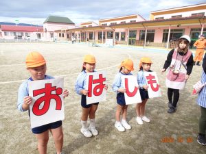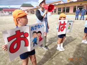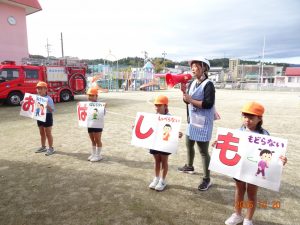 次に、防災標語「お・は・し・も」を子どもたちにあらためて指導しました。