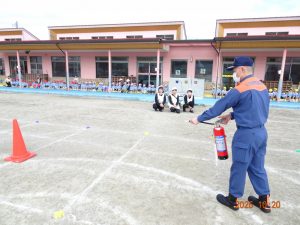 その後、職員を対象に「消火器」の使い方を指導してもらい「消火訓練」を実施しました。