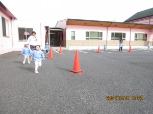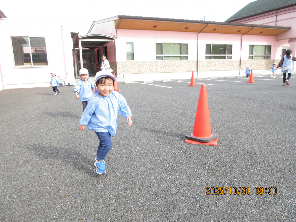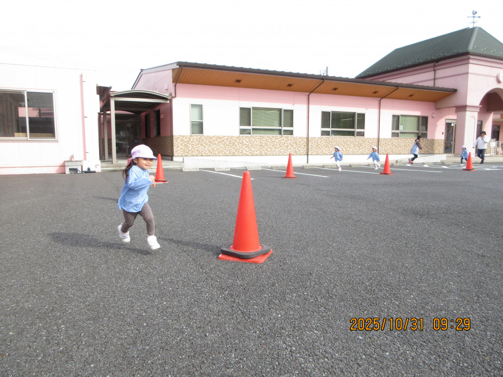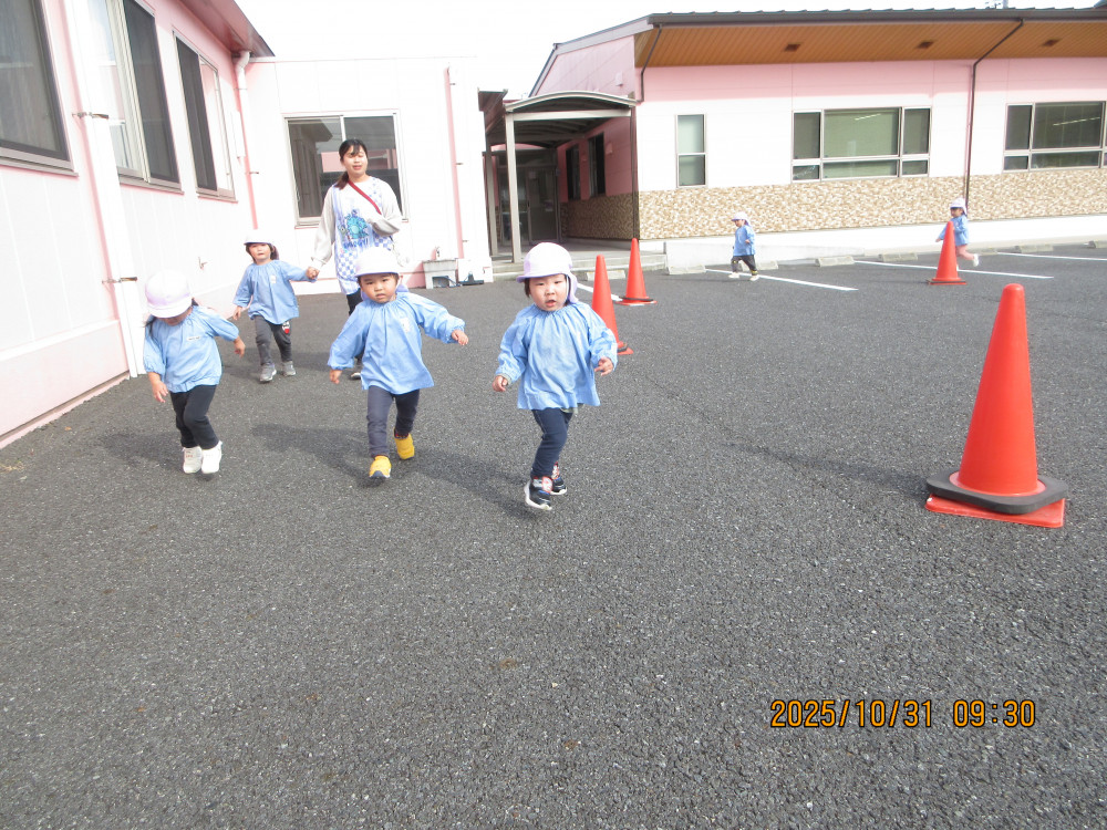 1週間後のマラソン大会(2歳児クラス以上4クラス対象)に向けて、本日、令和7年10月31日(金)もマラソンの練習です。