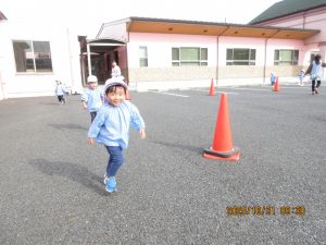 マラソン大会初参加の2歳児クラスすみれ組と一緒にマラソンコースを走りました。