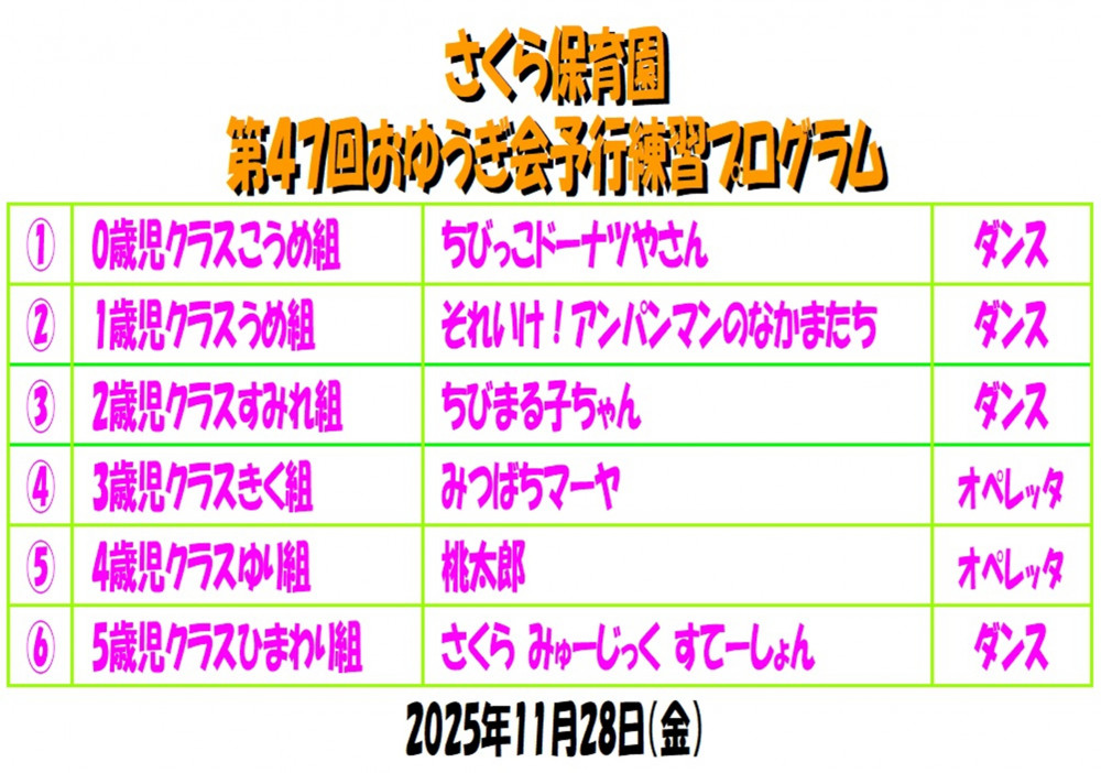 「さくら保育園第47回お遊戯会」を1週間後に控えた本日、令和7年11月28日(金)は、観覧希望保護者を募り、公開リハーサル=公開予行練習を行いました。