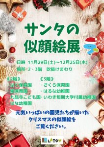 現在、さくら保育園の3歳児クラス以上(きく・ゆり・ひまわり組)の子どもたちが描いた「サンタの似顔絵」が展示されており、それを見学するためです。