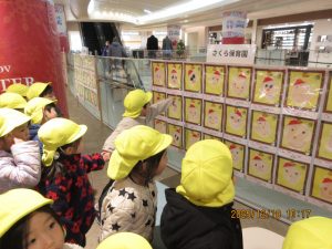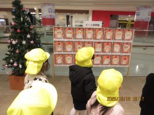 その後、3階フロアに移動し、自身で描いた「サンタの似顔絵」を探したり、他の幼稚園保育園さんの作品を見学してまわりました。