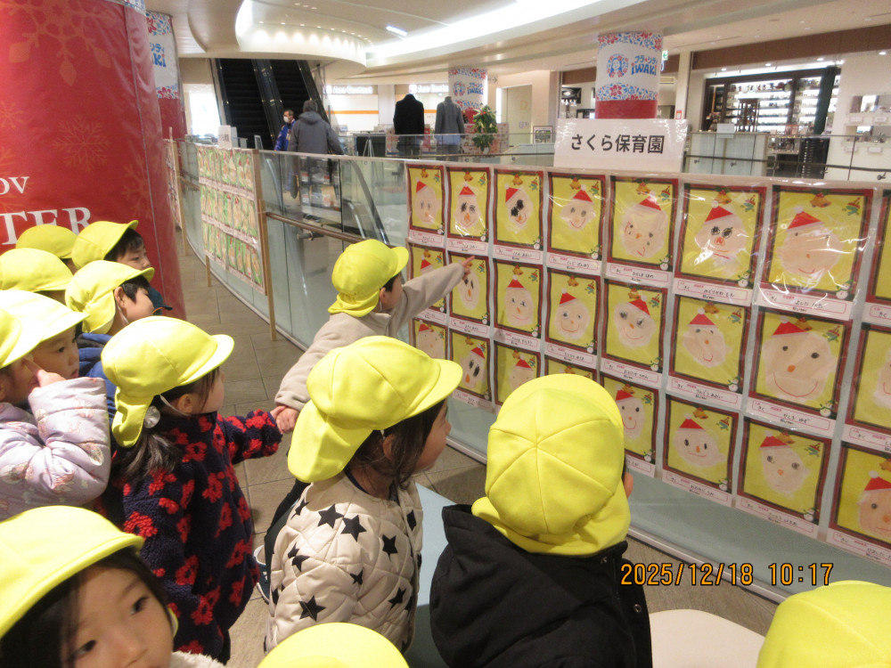 現在、さくら保育園の3歳児クラス以上(きく・ゆり・ひまわり組)の子どもたちが描いた「サンタの似顔絵」が展示されており、それを見学するためです。