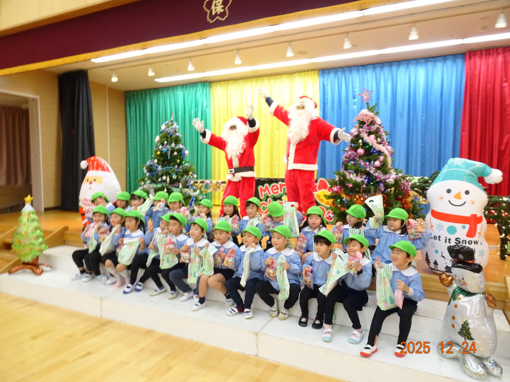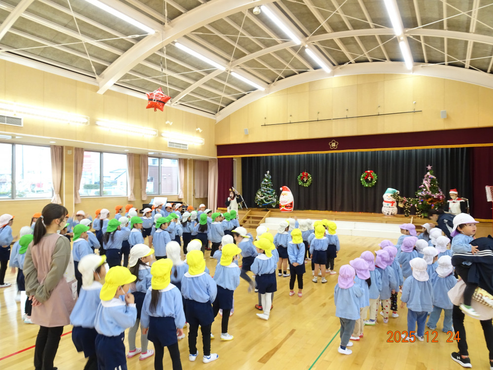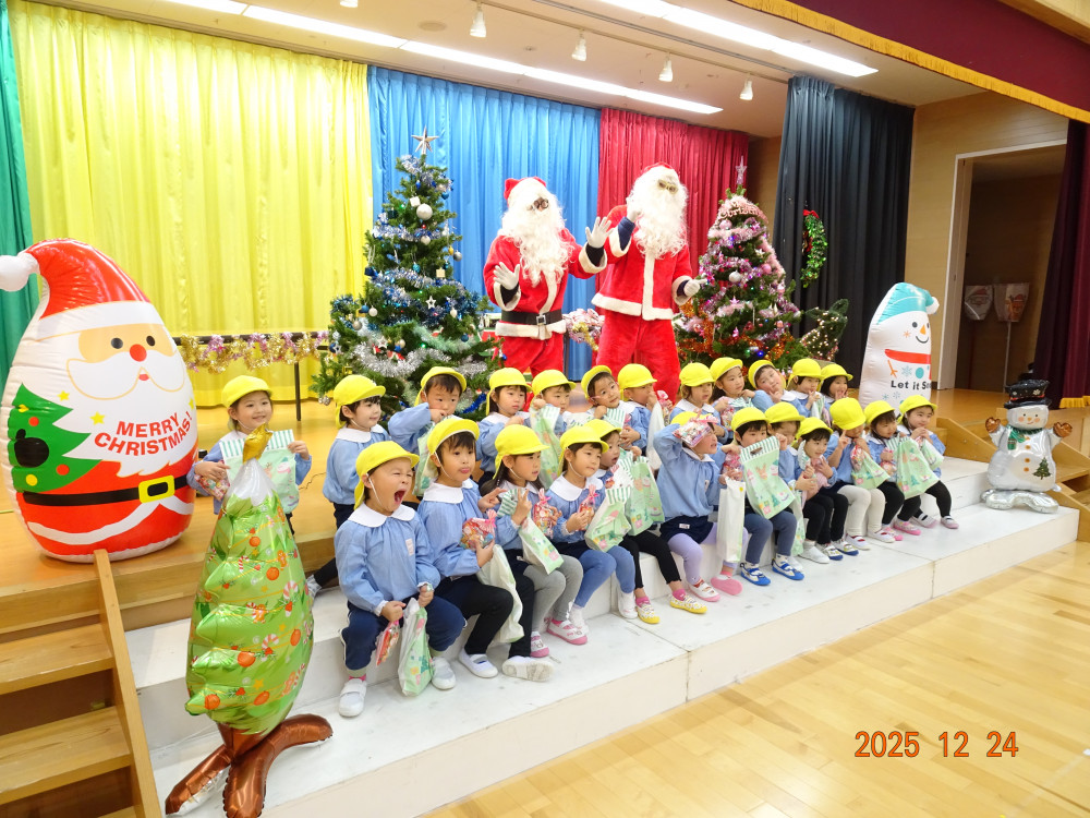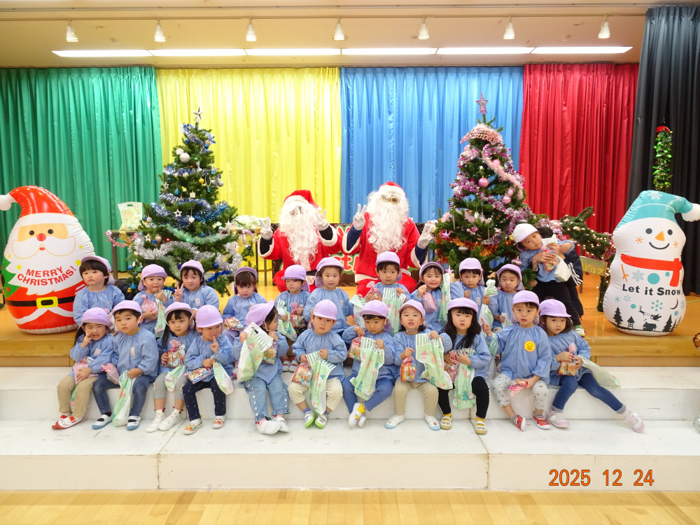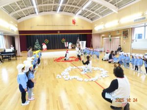 クリスマスイブの本日、令和7年12月24日(水)、2歳児クラス以上(すみれ・きく・ゆり・ひまわり組)の参加で「クリスマス会」を行いました。