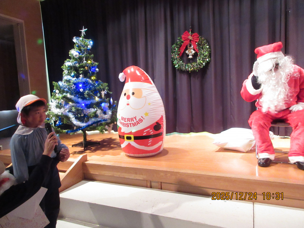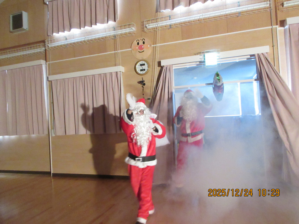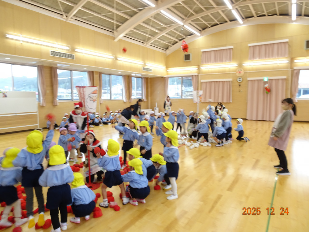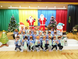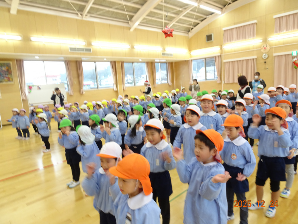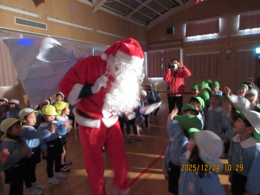 クリスマスイブの本日、令和7年12月24日(水)、2歳児クラス以上(すみれ・きく・ゆり・ひまわり組)の参加で「クリスマス会」を行いました。