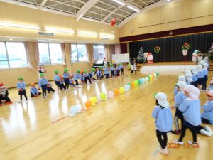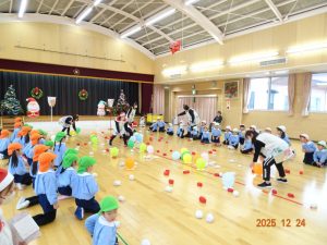 こちらも、縦割りにサンタチームとトナカイチームに分かれて、風船めがけてくす玉を投げ合い相手陣地に風船を押し込むゲームです。