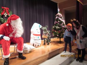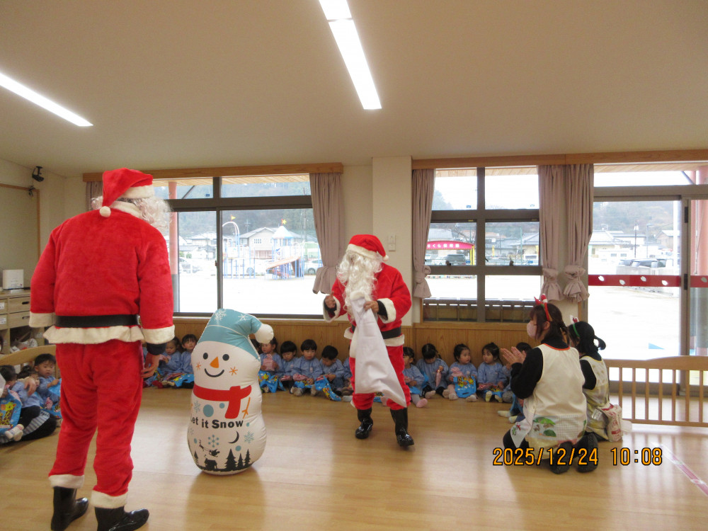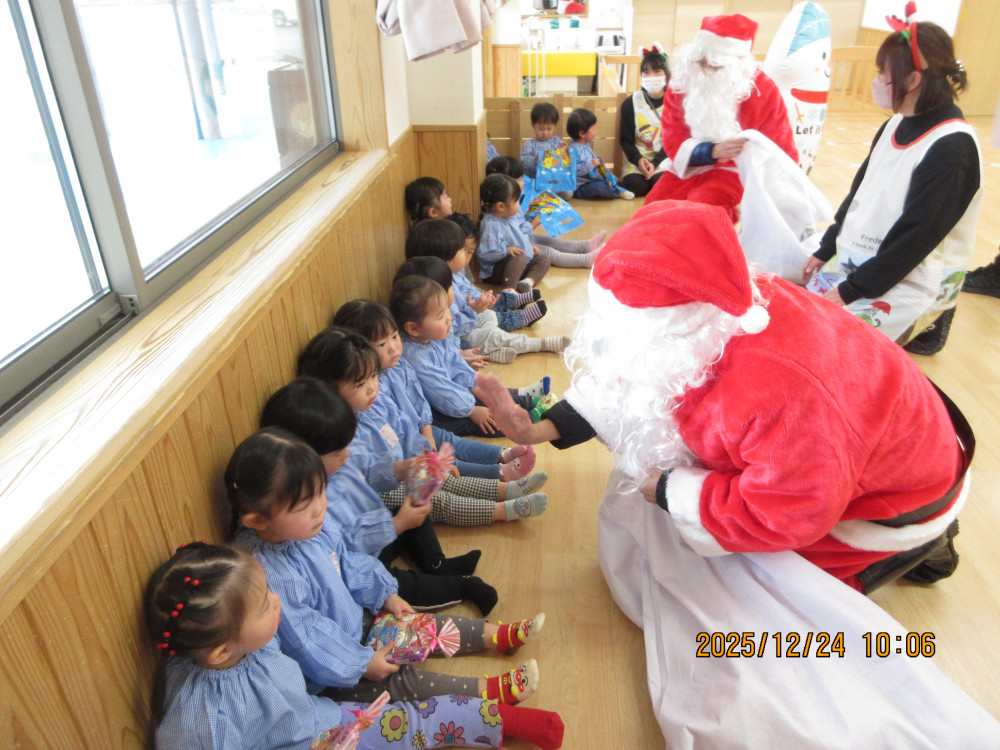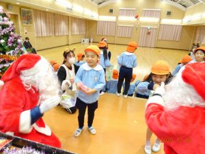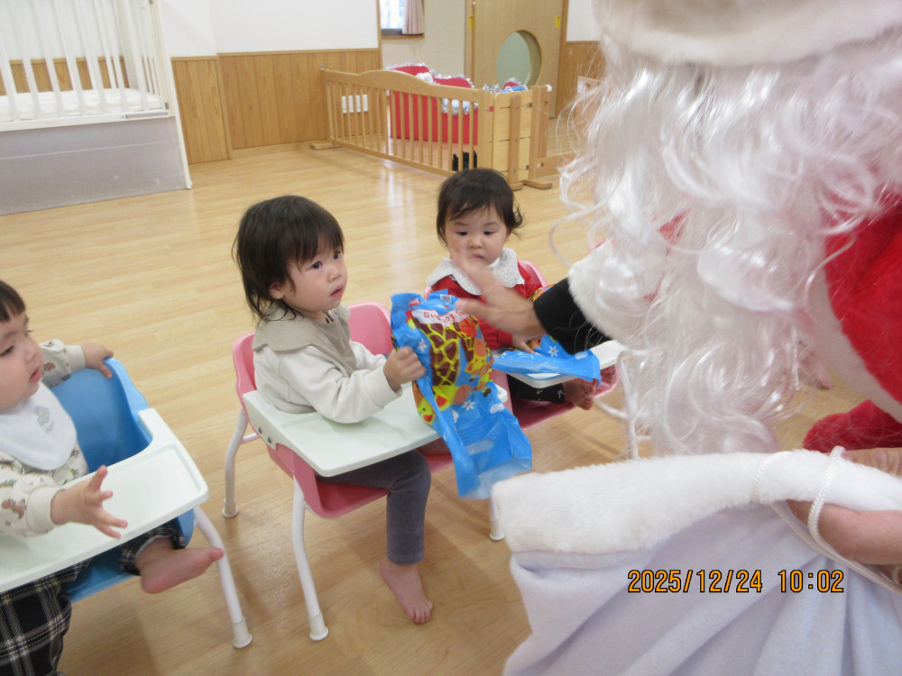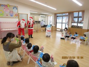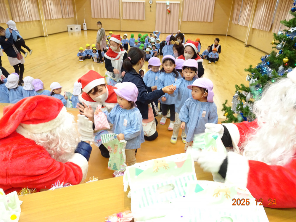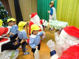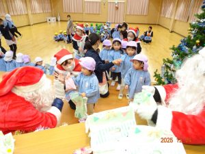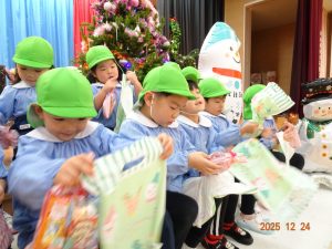 小さいクラスの子どもたちはサンタさんを怖がって泣いてしまう子もいましたがプレゼントはしっかり受け取っていました。