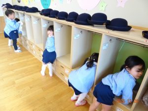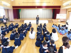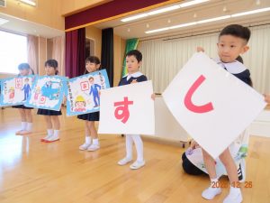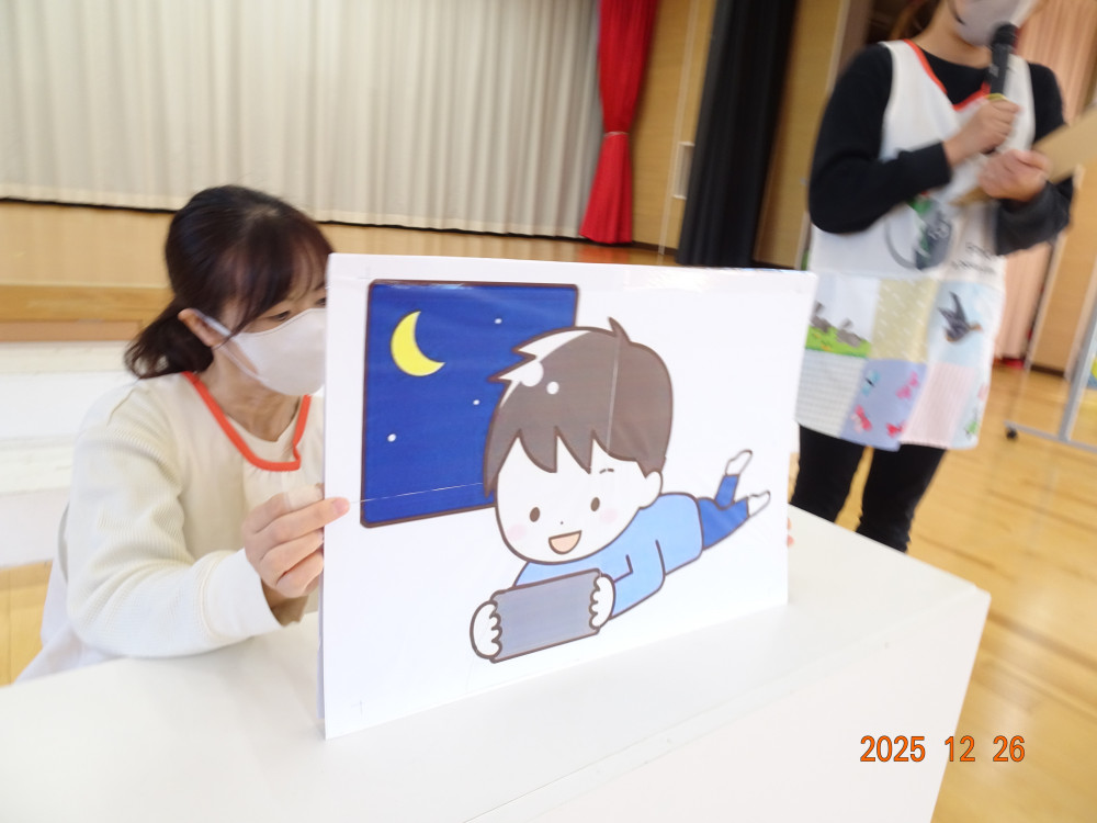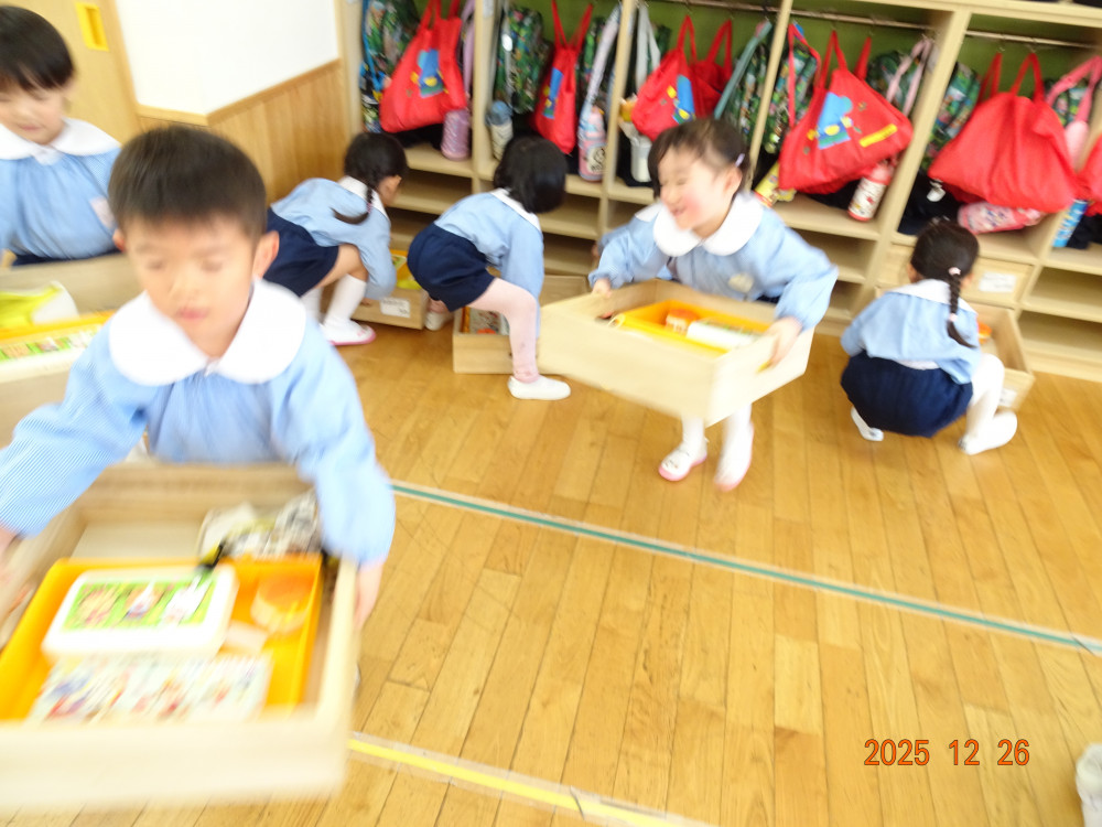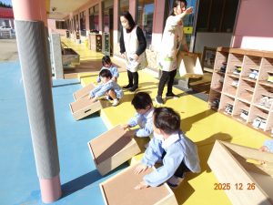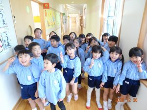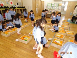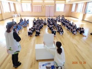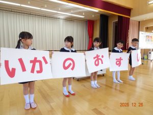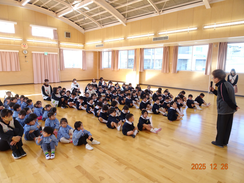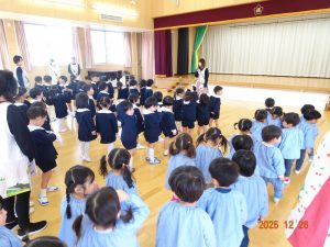 明日から「年末年始の休園」ということで、2歳児クラス以上の子どもたちがお遊戯室に集まり、園長先生から「事故やケガに気を付けて、おうちで楽しい年末年始を過ごしてください。」とお話がありました。