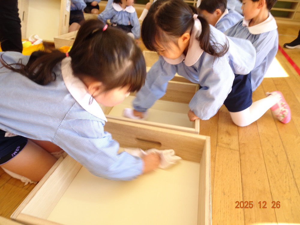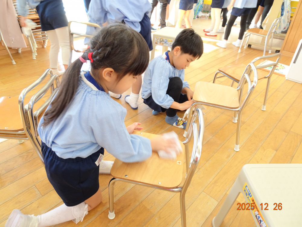 その後、教室に戻り、お部屋の「大掃除」を行いました。
