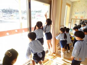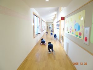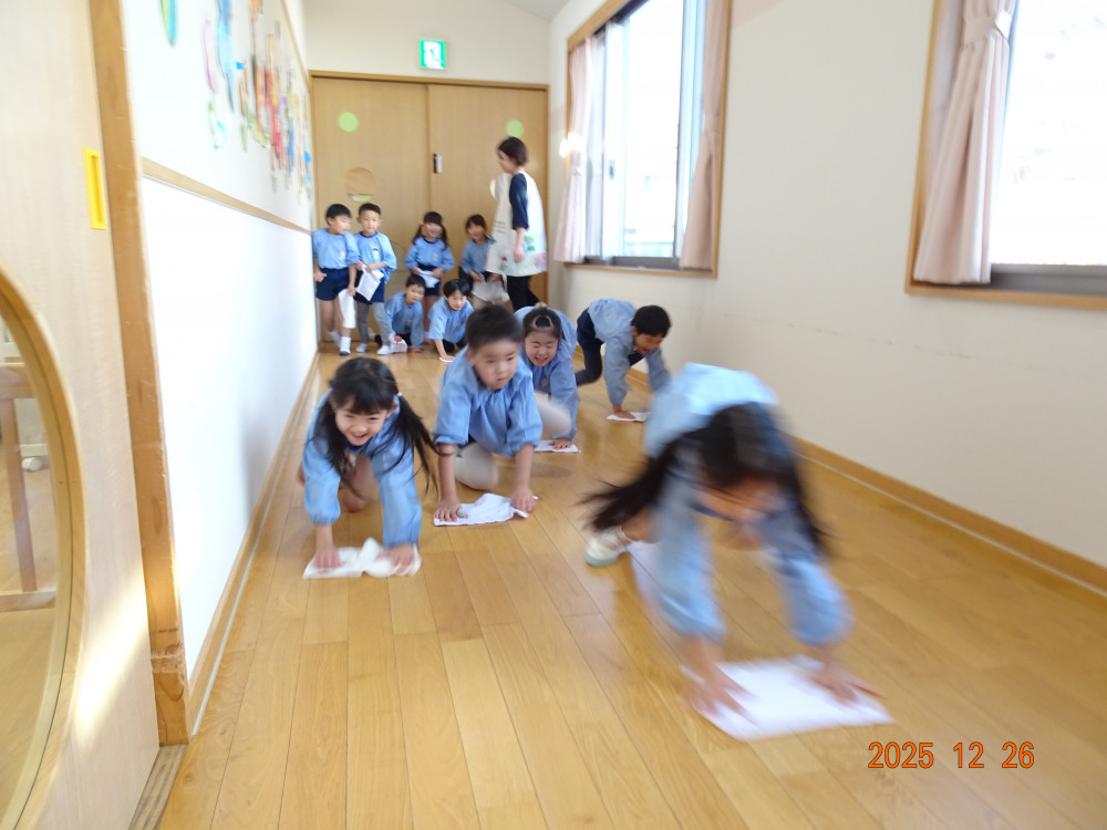 5歳児クラスひまわり組の子どもたちは、60メートルもある長い長い内廊下を雑巾がけしてくれました。