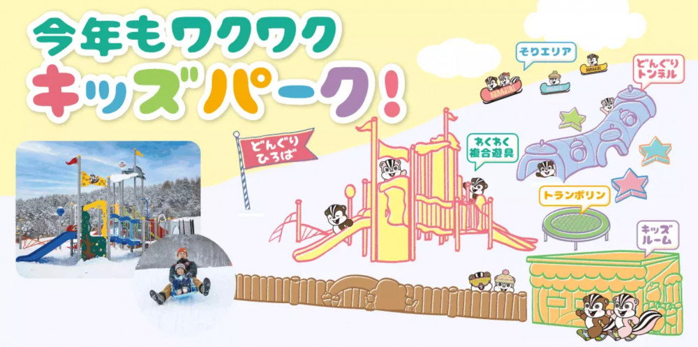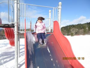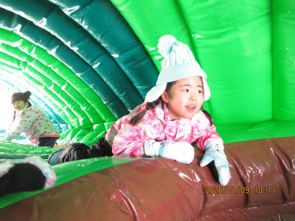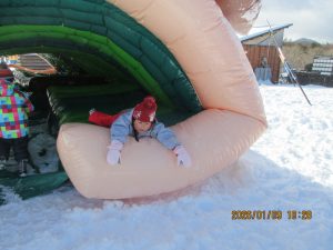 そして、キッズパーク「どんぐり広場」で、滑り台やどんぐりトンネルやトランポリンで遊び、雪合戦やソリ滑りもしました。