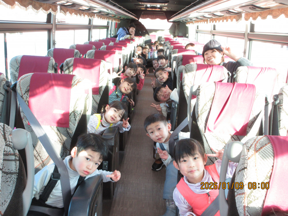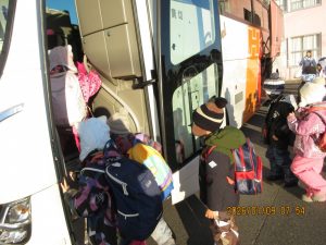出発式では園長先生に「いってきます!」と元気にあいさつをして、お見送りのお父さんお母さんたちに手を振りながら観光バスに乗り、午前8時に保育園を出発。