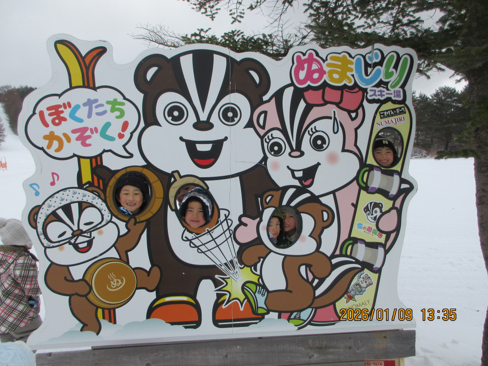 沼尻スキー場のマスコット「ぬまじリスくん」も遊びに来てくれ、みんな大喜び