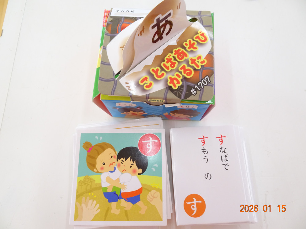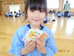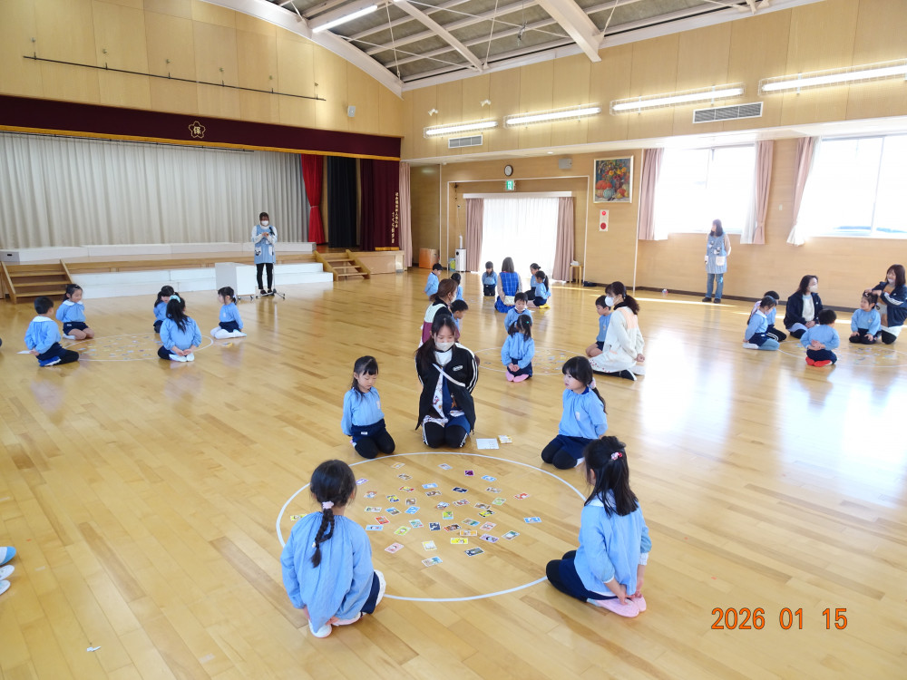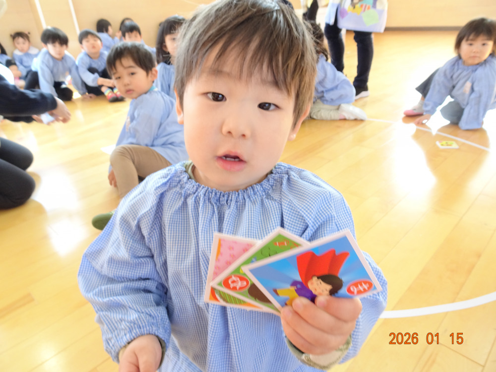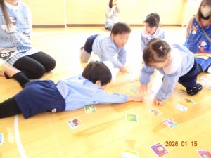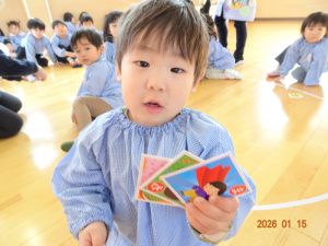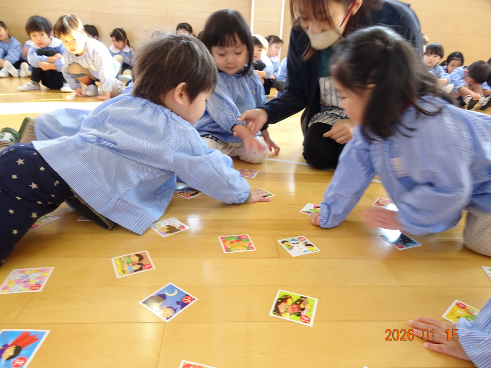 2歳児クラスすみれ組は「ことばあそびかるた」、3歳児クラスきく組は「どうぶつかるた」、4歳児クラスゆり組は「ゲゲゲの鬼太郎かるた」、5歳児クラスひまわり組は「しょうがっこうってなぁに?かるた」です。