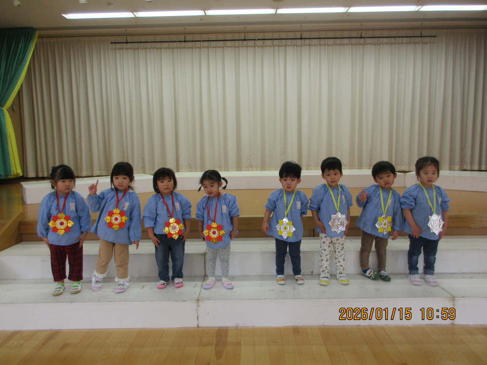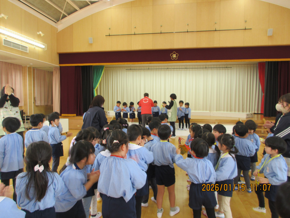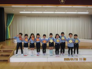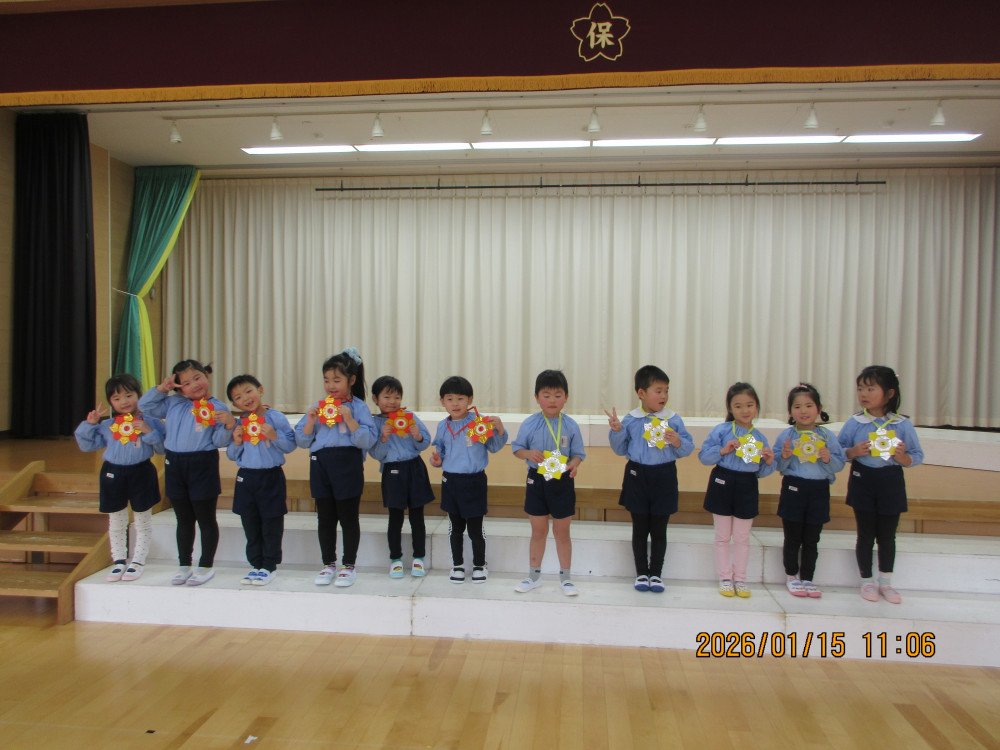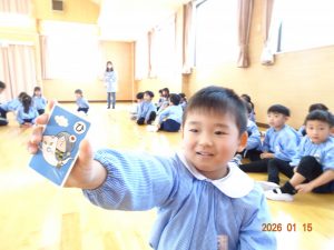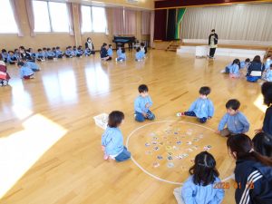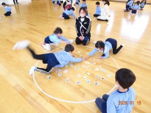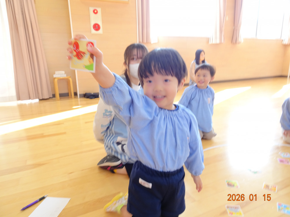 2歳児クラスすみれ組は「ことばあそびかるた」、3歳児クラスきく組は「どうぶつかるた」、4歳児クラスゆり組は「ゲゲゲの鬼太郎かるた」、5歳児クラスひまわり組は「しょうがっこうってなぁに?かるた」です。