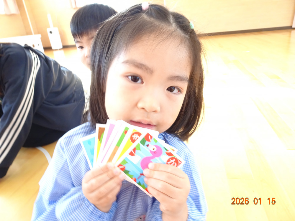 さくら保育園では、2歳児クラス以上にかるたを配布し、年末年始休園中はおうちに持ち帰ってご家族で一緒に遊んだと思いますが、年明けからはクラスのお友だちと取ったカードの枚数を競って遊んでいます。
