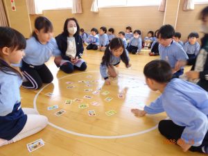 はじめに、子どもたちには改めて大会のルール(正しい姿勢で待機。取る時は元気よく「はい」。同時の時はじゃんけん。お手つきは1回休み。)を説明しました。
