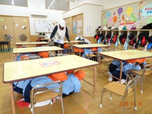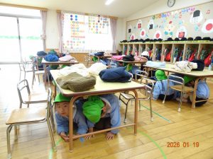 館内放送で地震が発生したことを告げ、子どもたちは机の下などに身を隠しました。