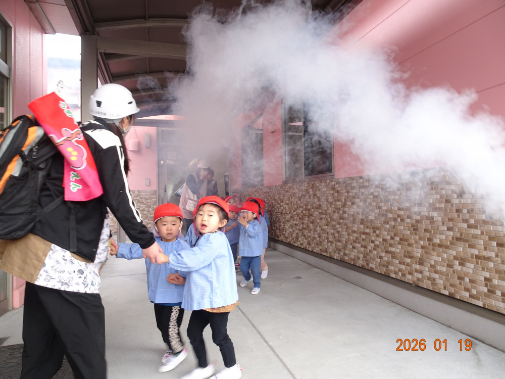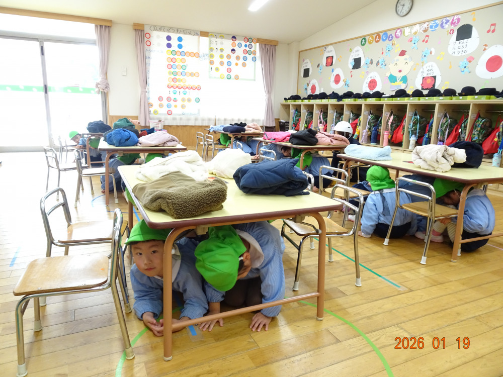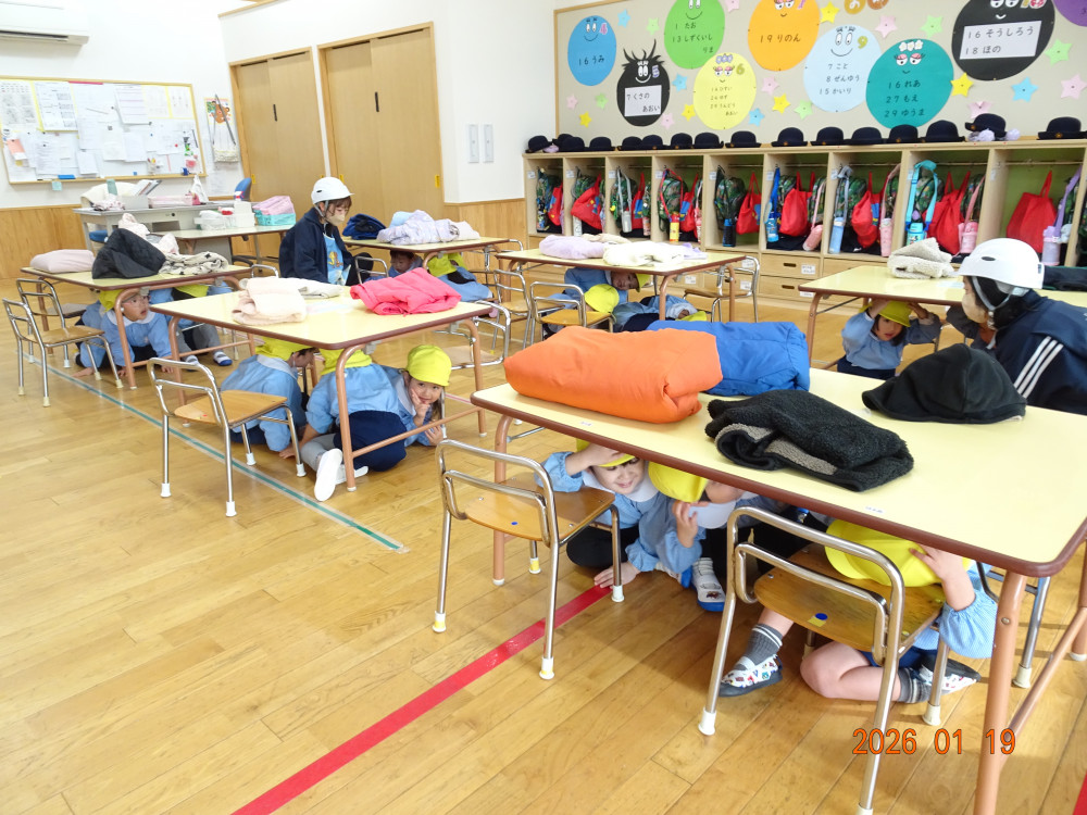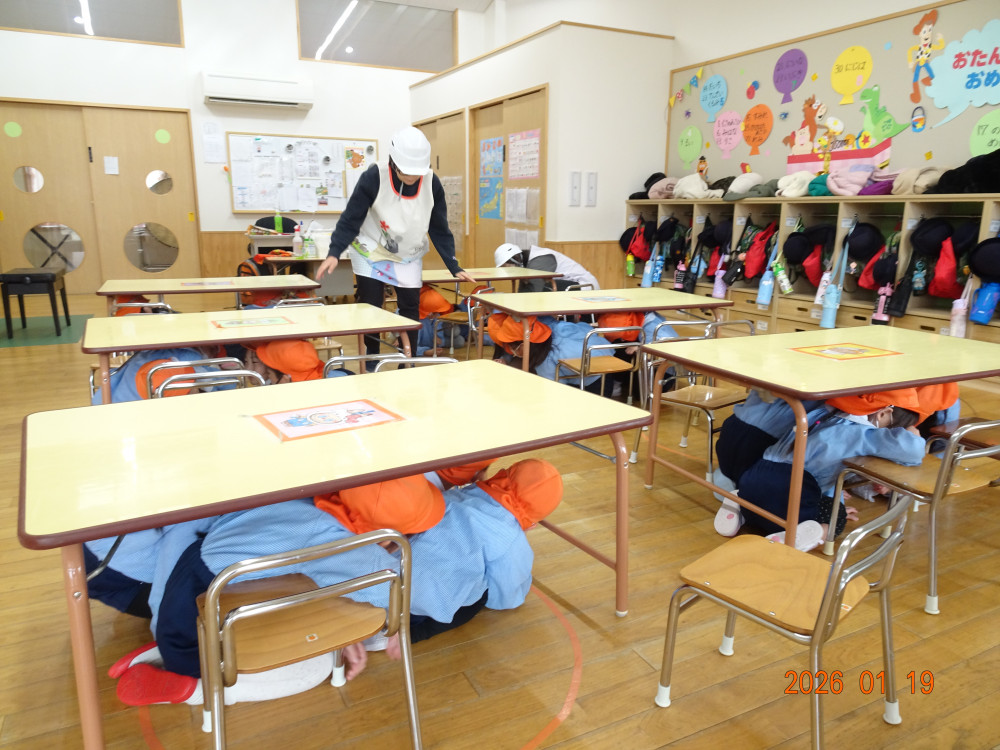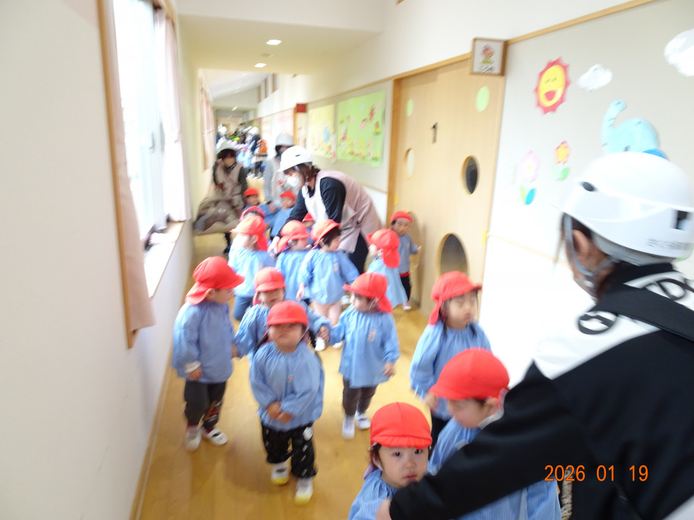 毎月一回実施している避難訓練。今月1月の災害のテーマは「地震火災」です。本日、令和8年1月19日(月)に実施しました。