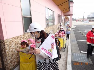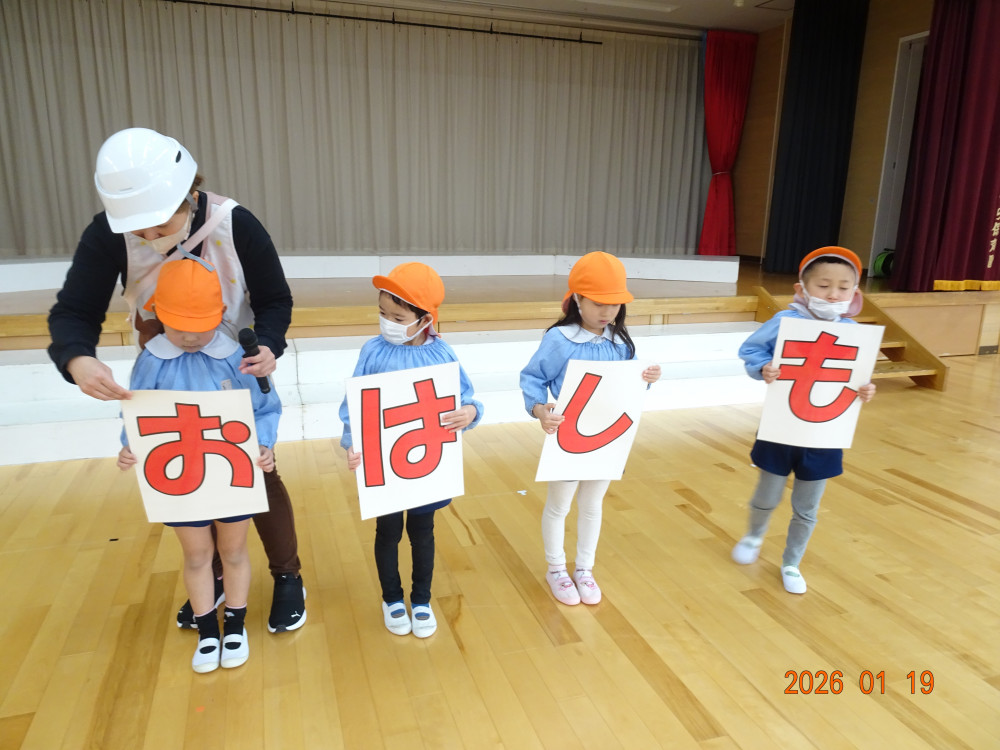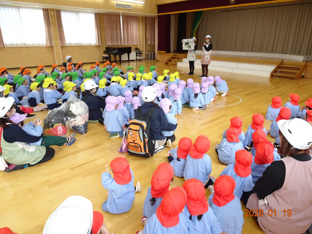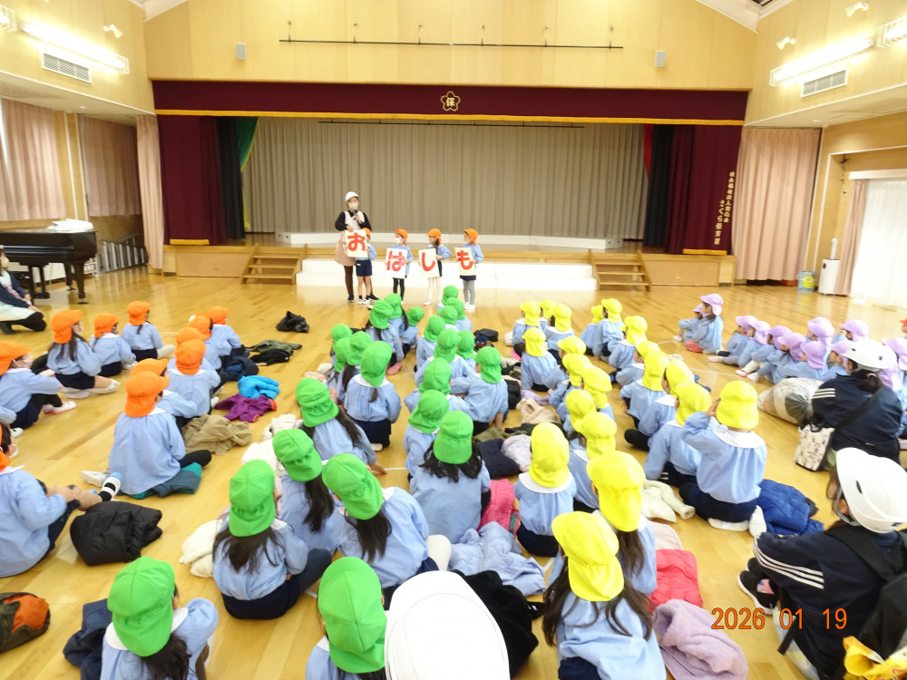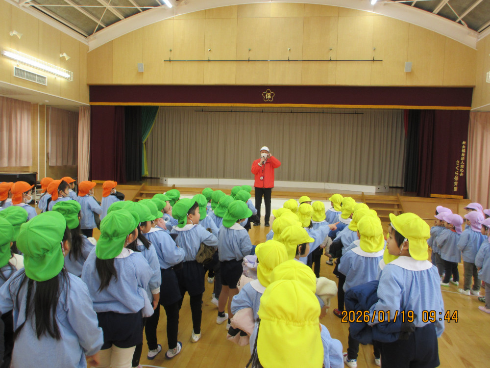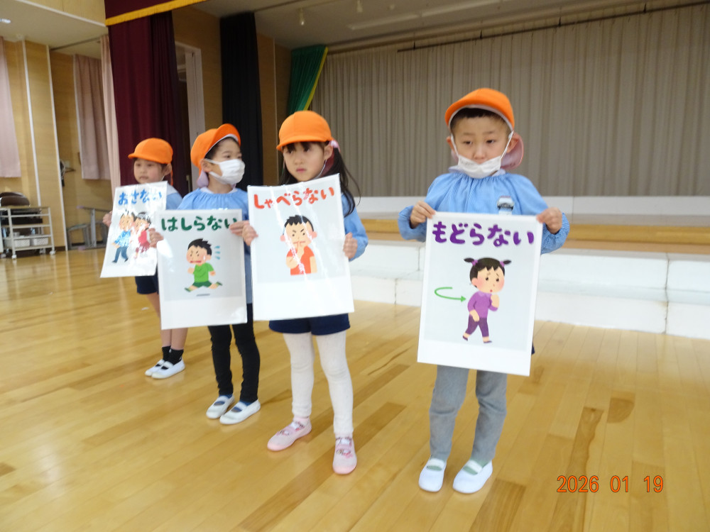 最後に、子どもたちにはあらためて避難訓練の標語「おはしも」(押さない・走らない・しゃべらない・戻らない)を守るよう指導しました。
