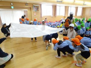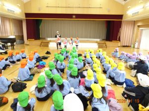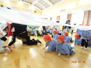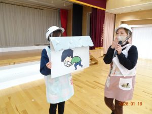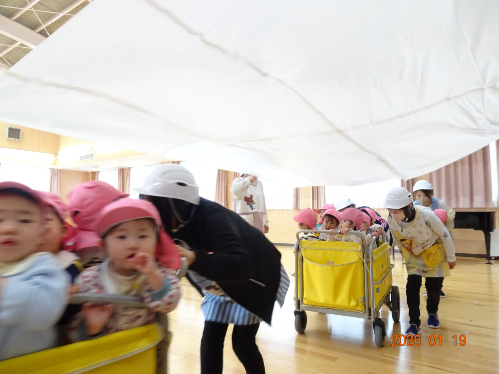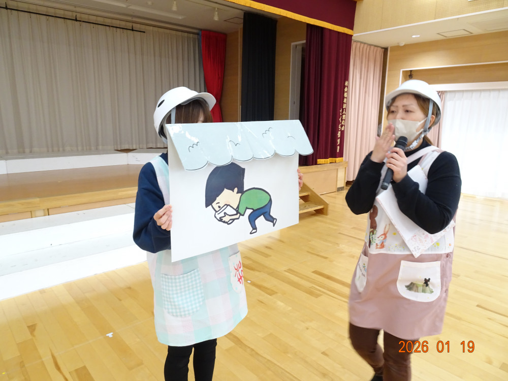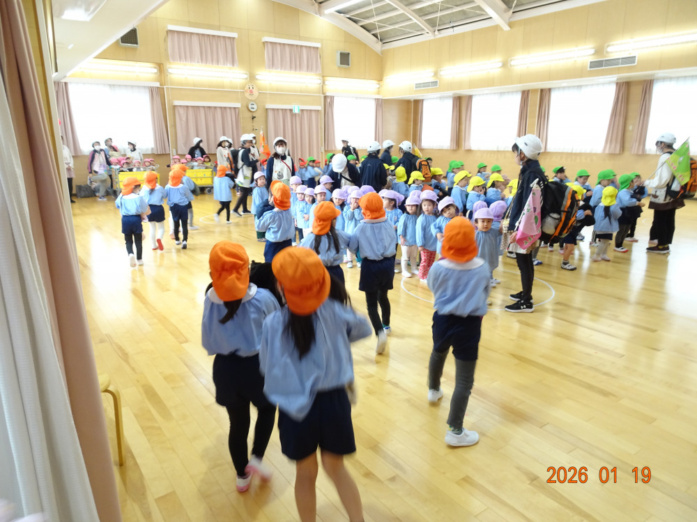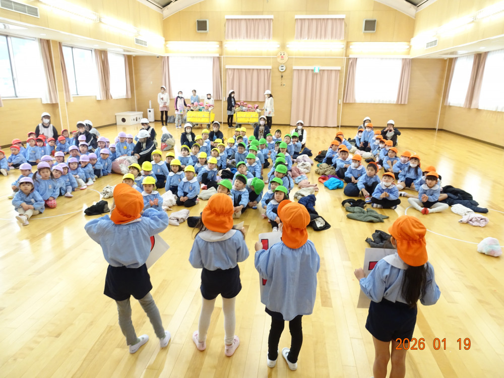 第2報でさくら保育園近隣の民家から火災が発生したことを告げ、子どもたちは先生の指示に従い防寒着を抱えてお遊戯室に避難。