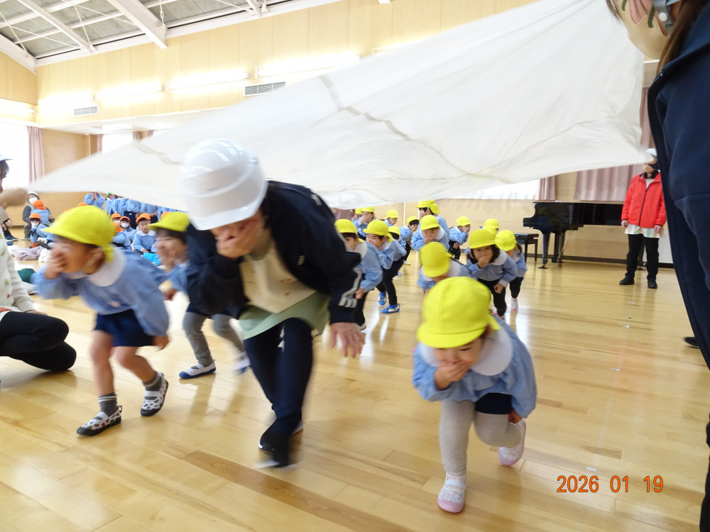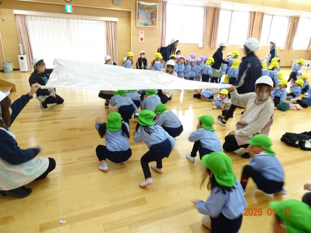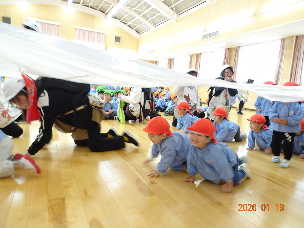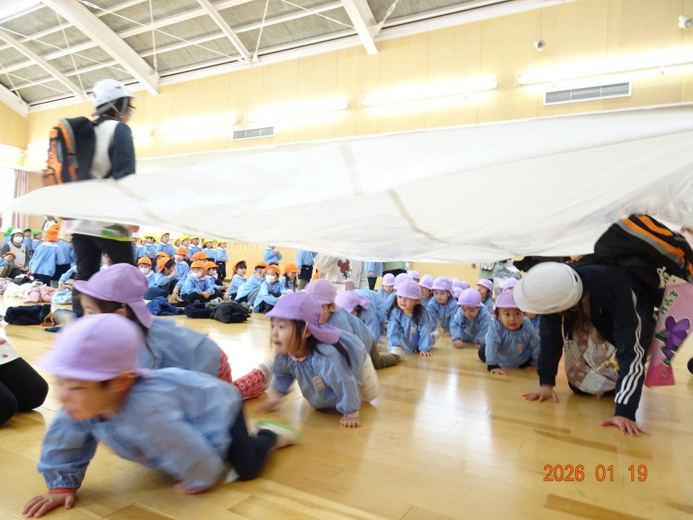 白いビニールシートを煙に見立てて、低い姿勢で煙の下をくぐる練習をしました。