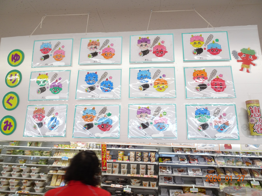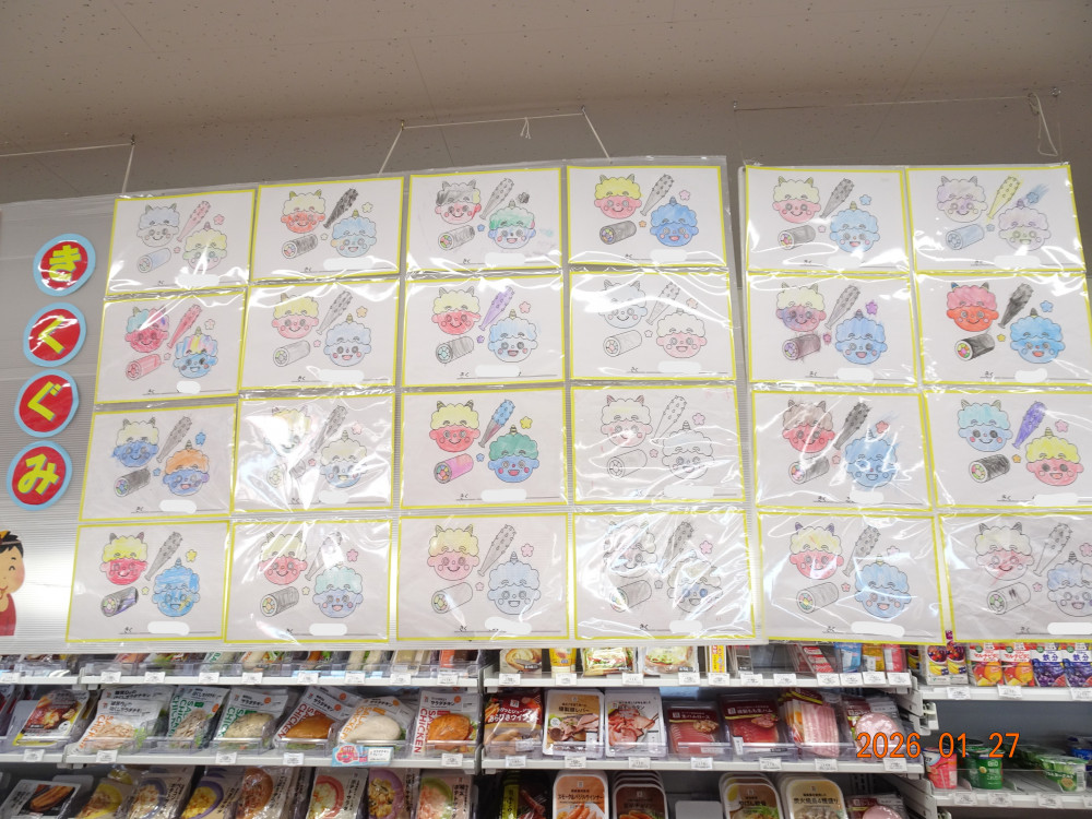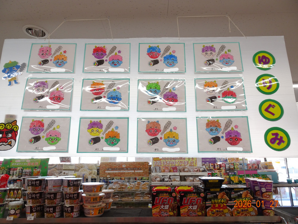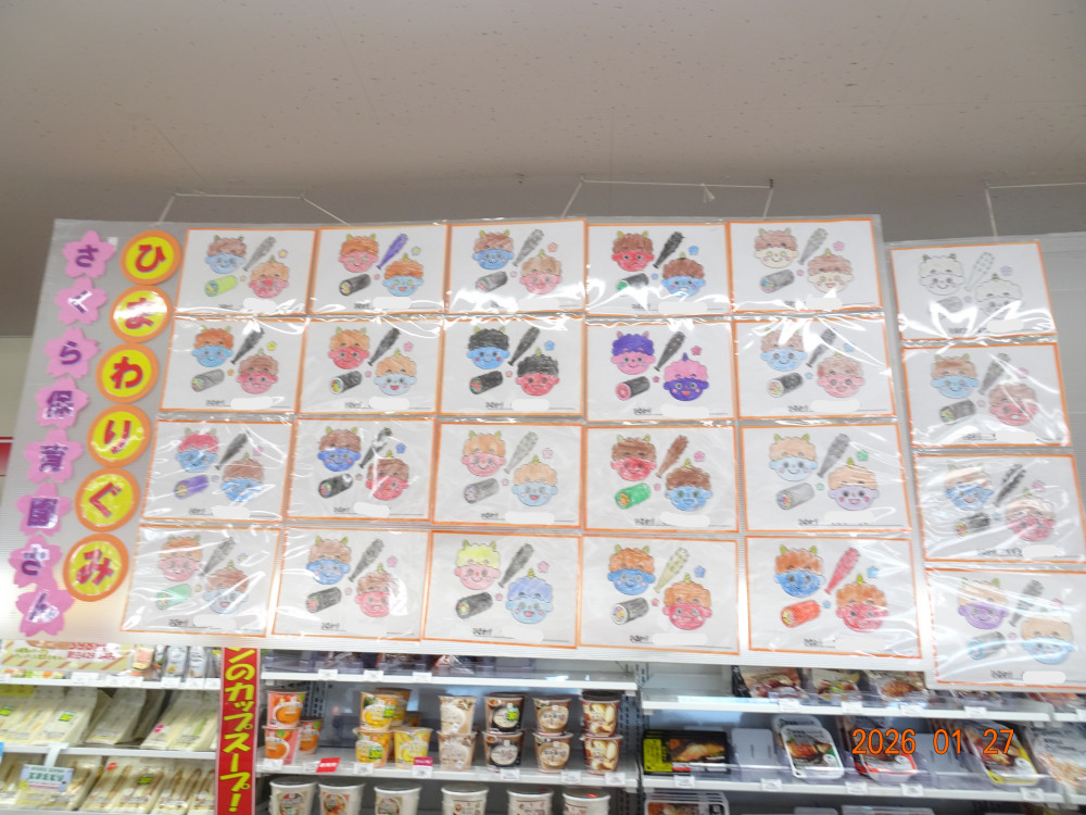 さくら保育園のお向かいにあるセブンイレブンいわき下好間店さんからのご依頼により3歳児クラスきく組・4歳児クラスゆり組・5歳児クラスひまわり組の子どもたちが色塗りした「節分の塗り絵」が、現在、店舗内に展示されています。