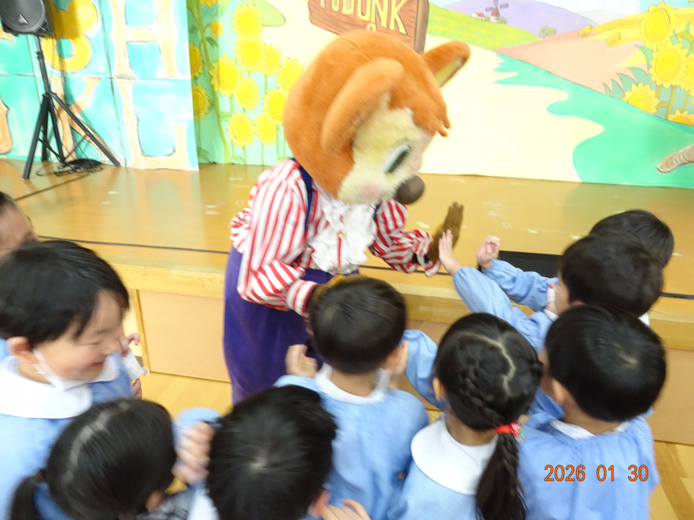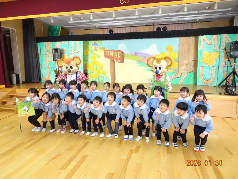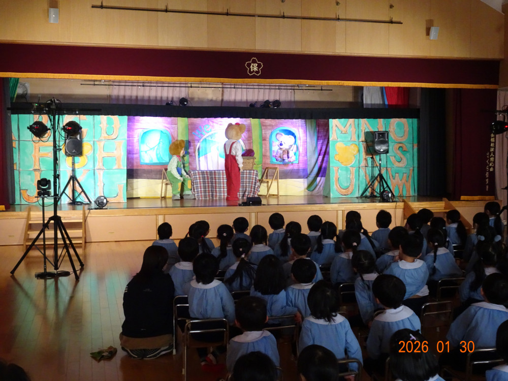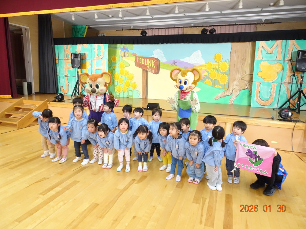 令和8年1月30日(金)、東京より「劇団バク」さんをさくら保育園にお招きして、お遊戯室にて、着ぐるみ人形劇「田舎のねずみと都会のねずみ」を上演していただきました。