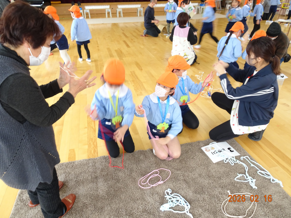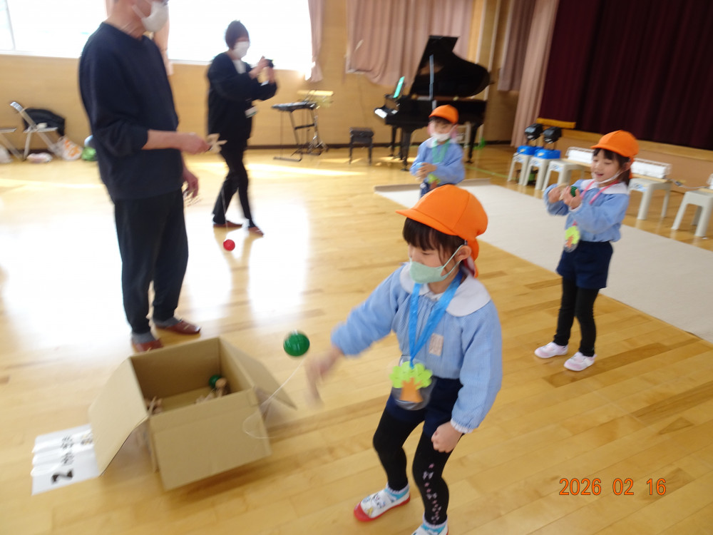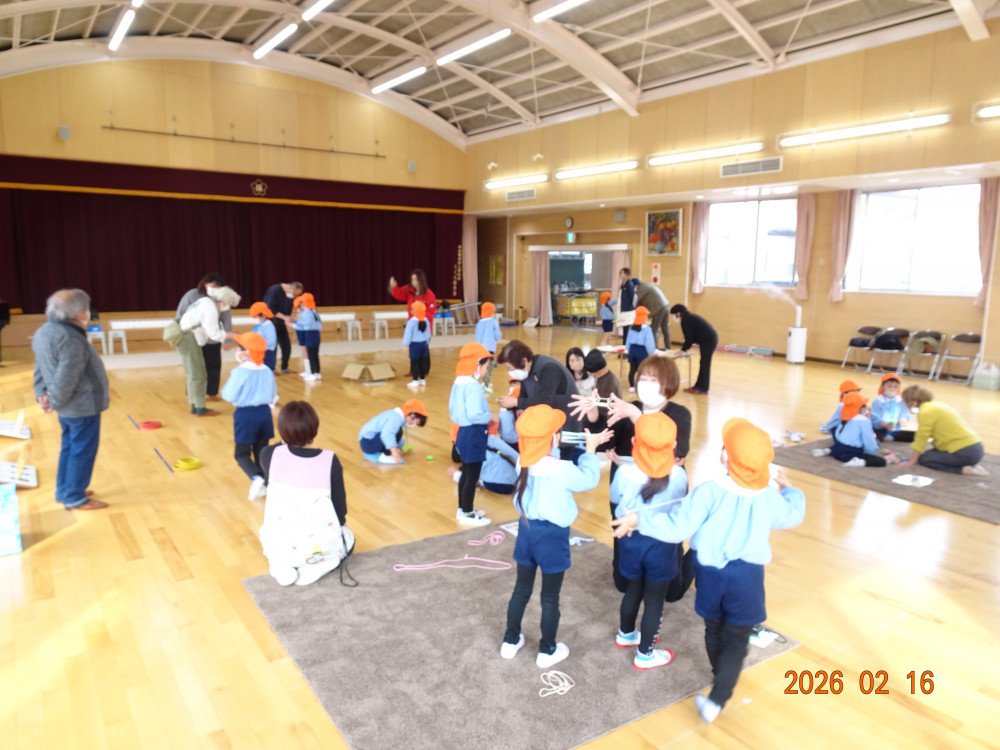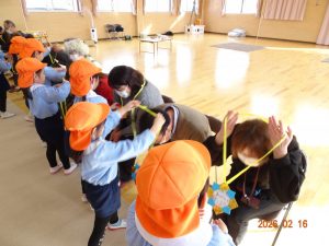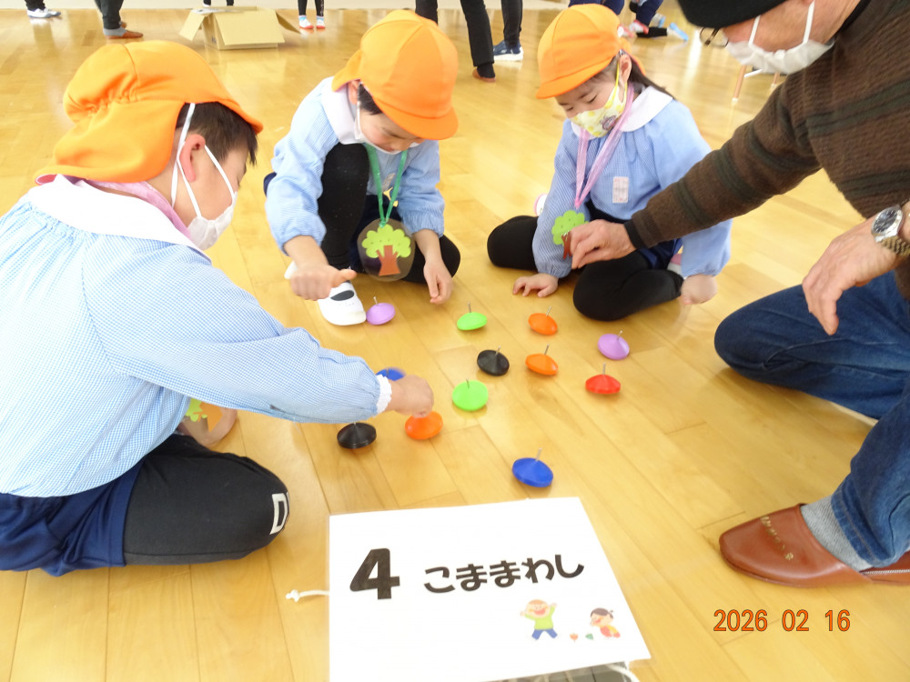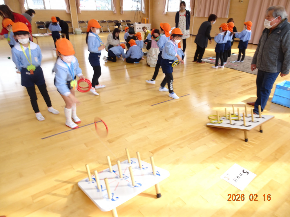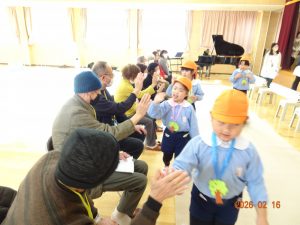 そして本日、令和8年2月16日(月)交流会開催の日、老人クラブ会員のおじいちゃんおばあちゃん方12名がさくら保育園に来てくださり、年長5歳児クラスひまわり組の子どもたちに「昔ながらの遊び」を教えてくださいました。