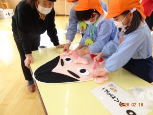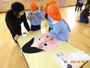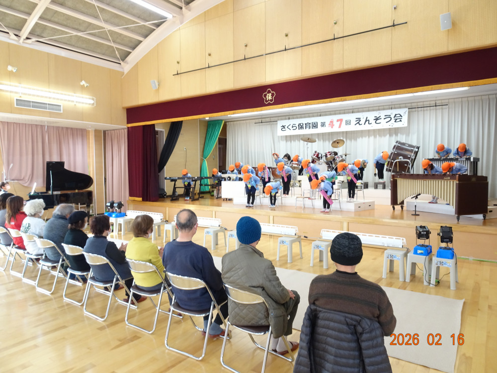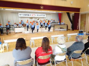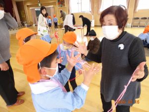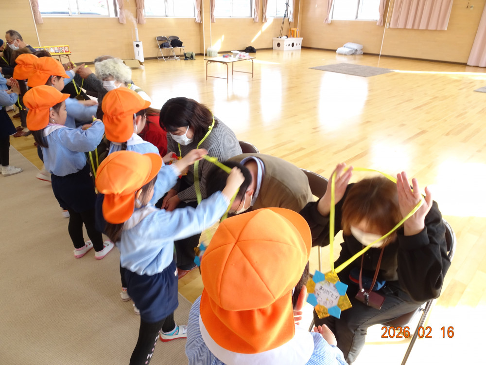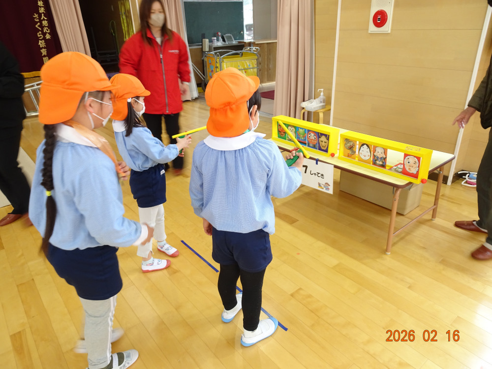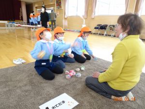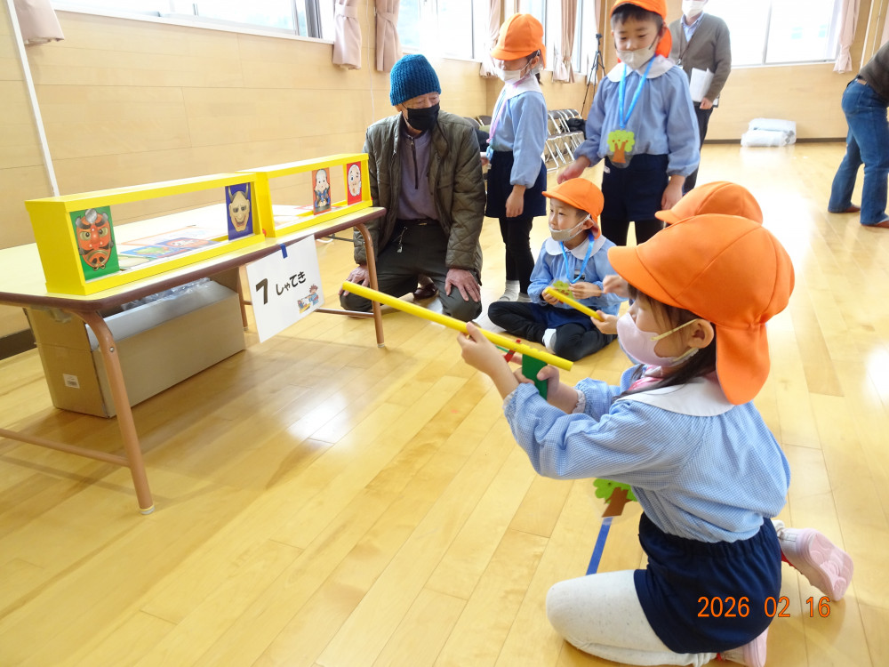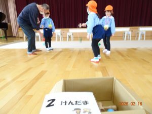 そして本日、令和8年2月16日(月)交流会開催の日、老人クラブ会員のおじいちゃんおばあちゃん方12名がさくら保育園に来てくださり、年長5歳児クラスひまわり組の子どもたちに「昔ながらの遊び」を教えてくださいました。