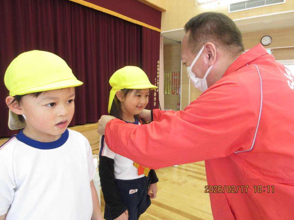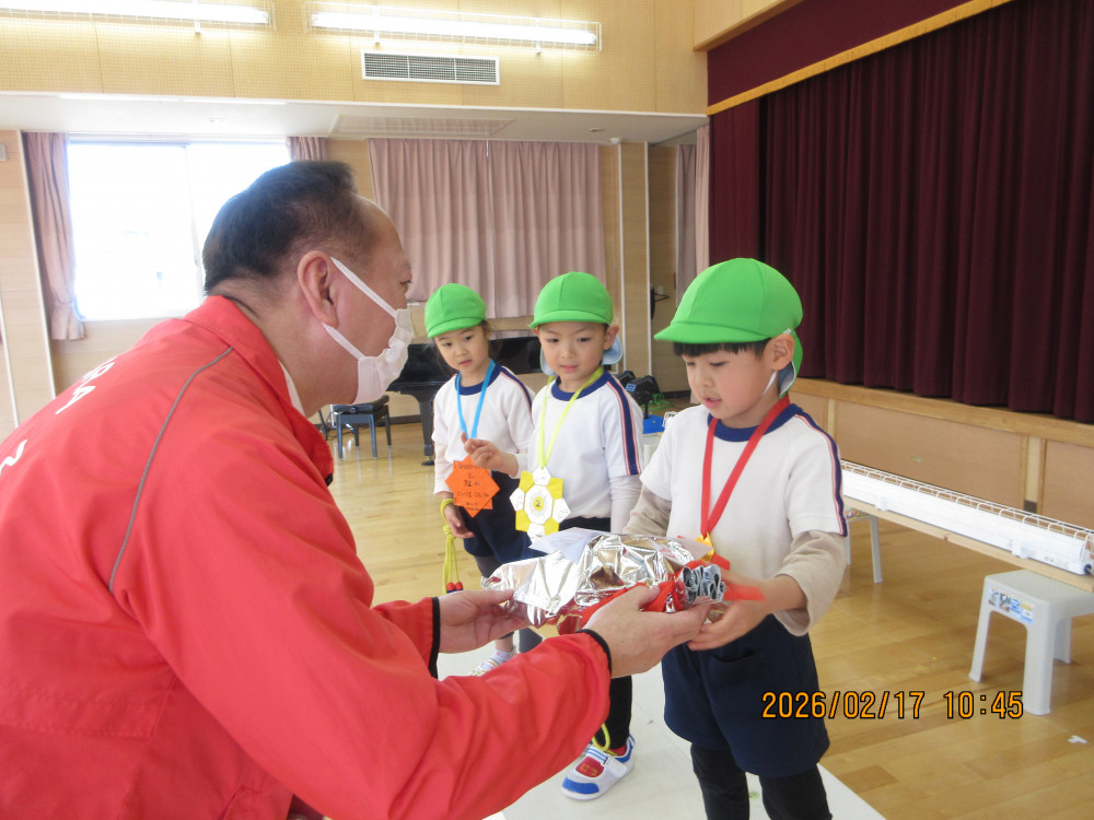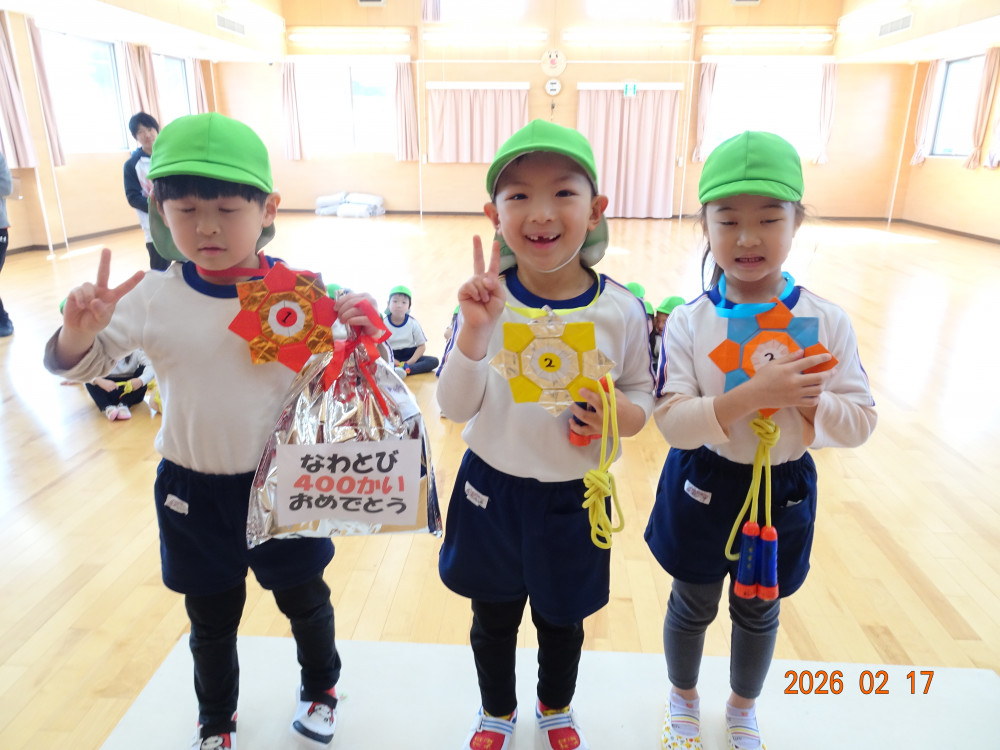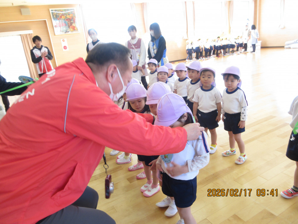 各クラスごと測定会および表彰式を行い、跳躍回数上位の子たちには園長先生からご褒美のメダルが授与されました。おめでとうございます。