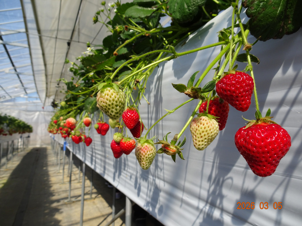 3,000㎡の広大なハウスの中は、いちごの甘酸っぱい香りに包まれ、おいしそうに赤く実ったいちごが鈴なりにたくさんぶらさがっていました🍓