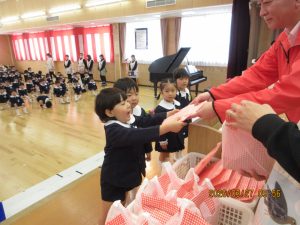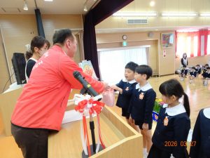 クラス担任から一人ずつ名前を呼ばれ、子どもたちは元気に返事をして起立し、各クラス代表園児が園長先生からご褒美を受け取りました。