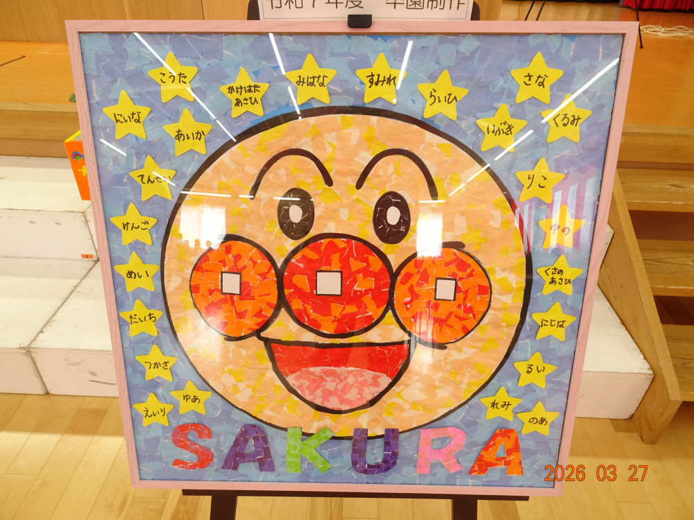 令和7年度の卒園製作は、さくら保育園お遊戯室の「目線ボード」です。ステージ上から客席に視線を向けたときの目線マーク「アンパンマンボード」です。