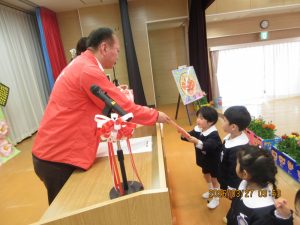 園長先生が「大切に使わせてもらいます。」とひまわり組にお礼を言いました。
