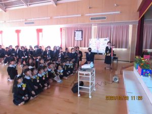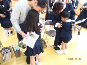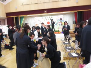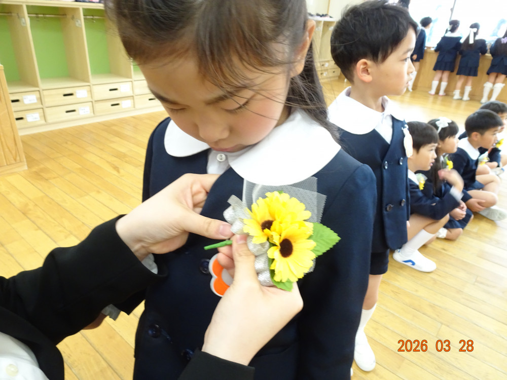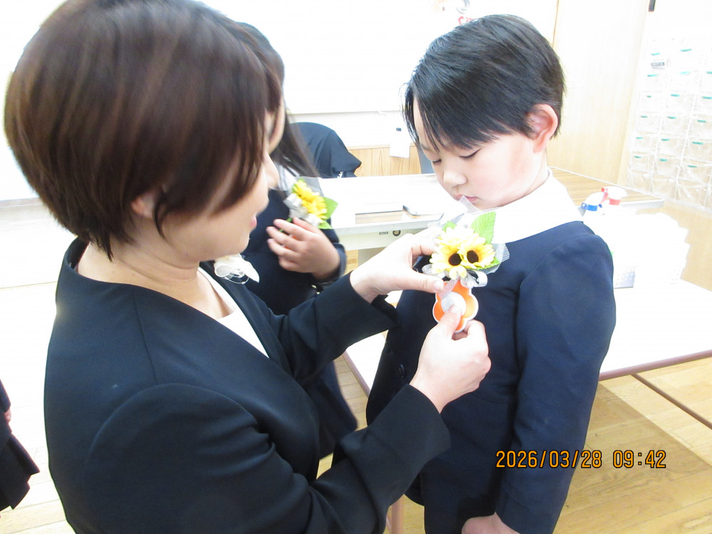 卒園式の前に、子どもたちはクラス担任から一人ひとり制服に「ひまわり」のコサージュを付けてもらい式にのぞみました。