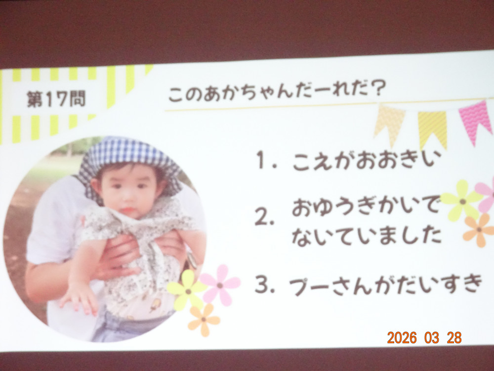 プロジェクターとスクリーンを使って「この赤ちゃんだ~れだ?」クイズをしたり、保育園入園の0歳の時からの6年間の思い出ムービーを上映していただきました。