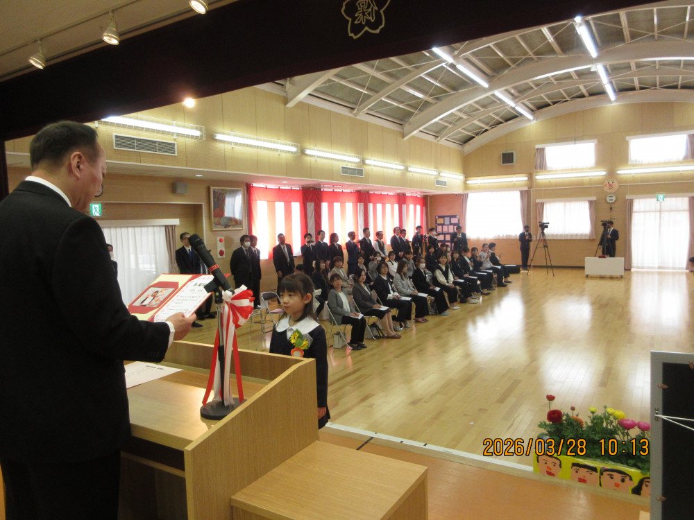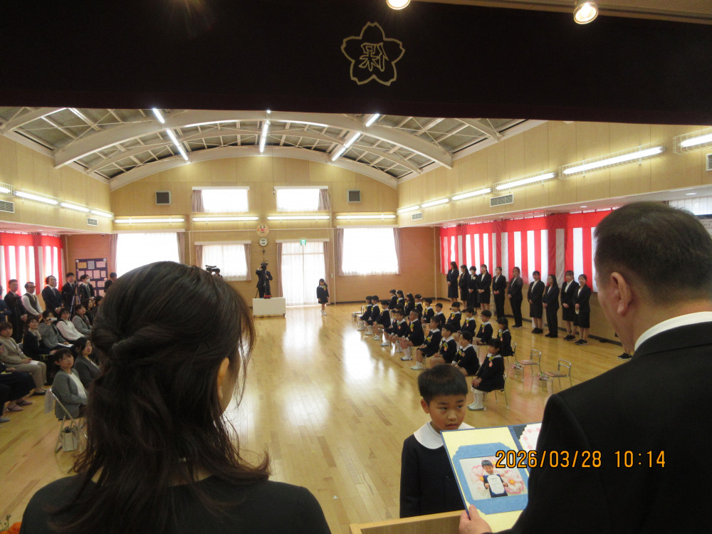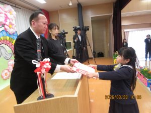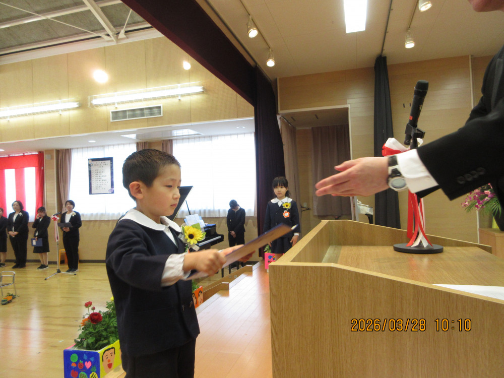 午前10時、お遊戯室で卒園式が始まり、園長先生から一人ひとり「卒園証書」を受け取ったひまわり組の子どもたち。みんな堂々として一段と成長を感じました。