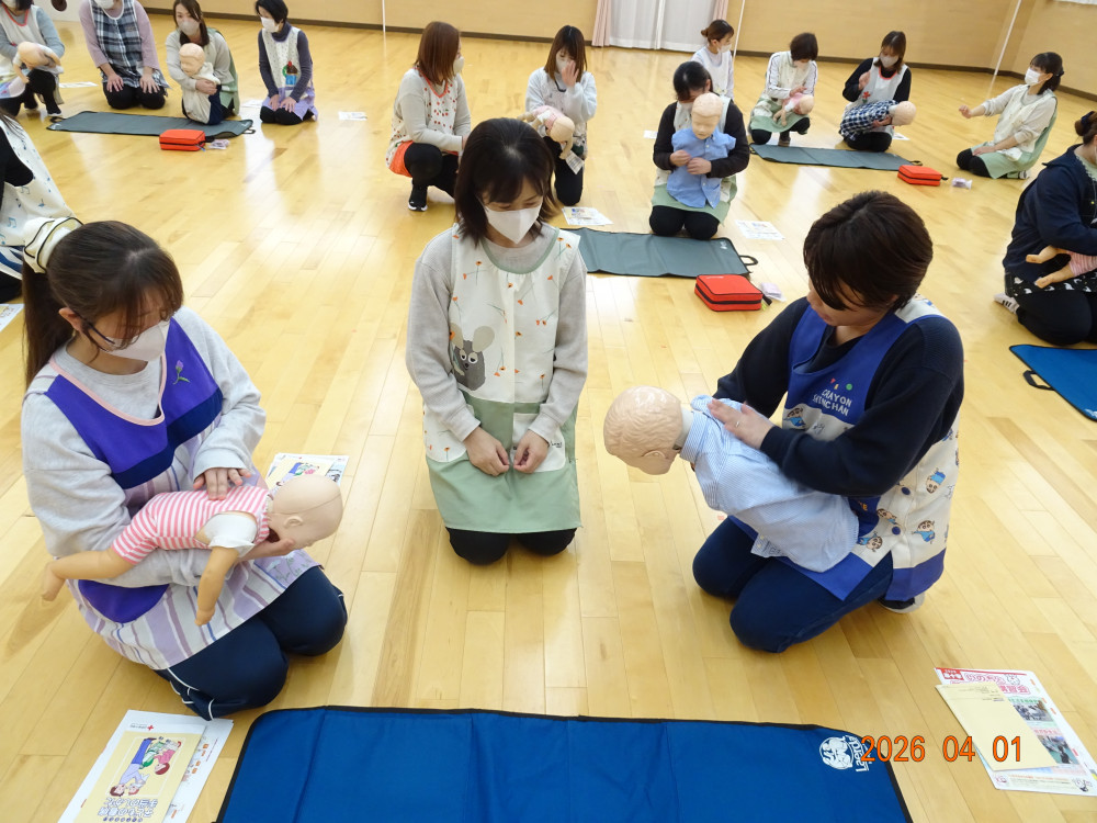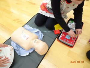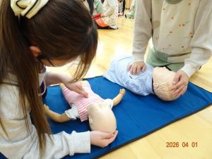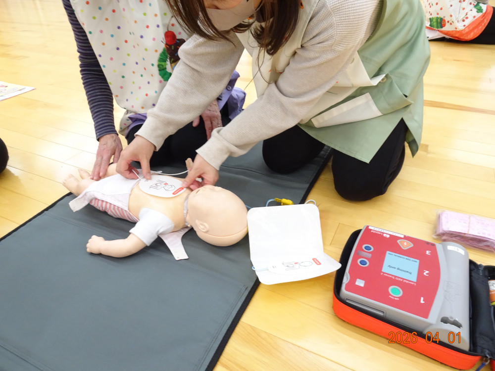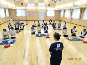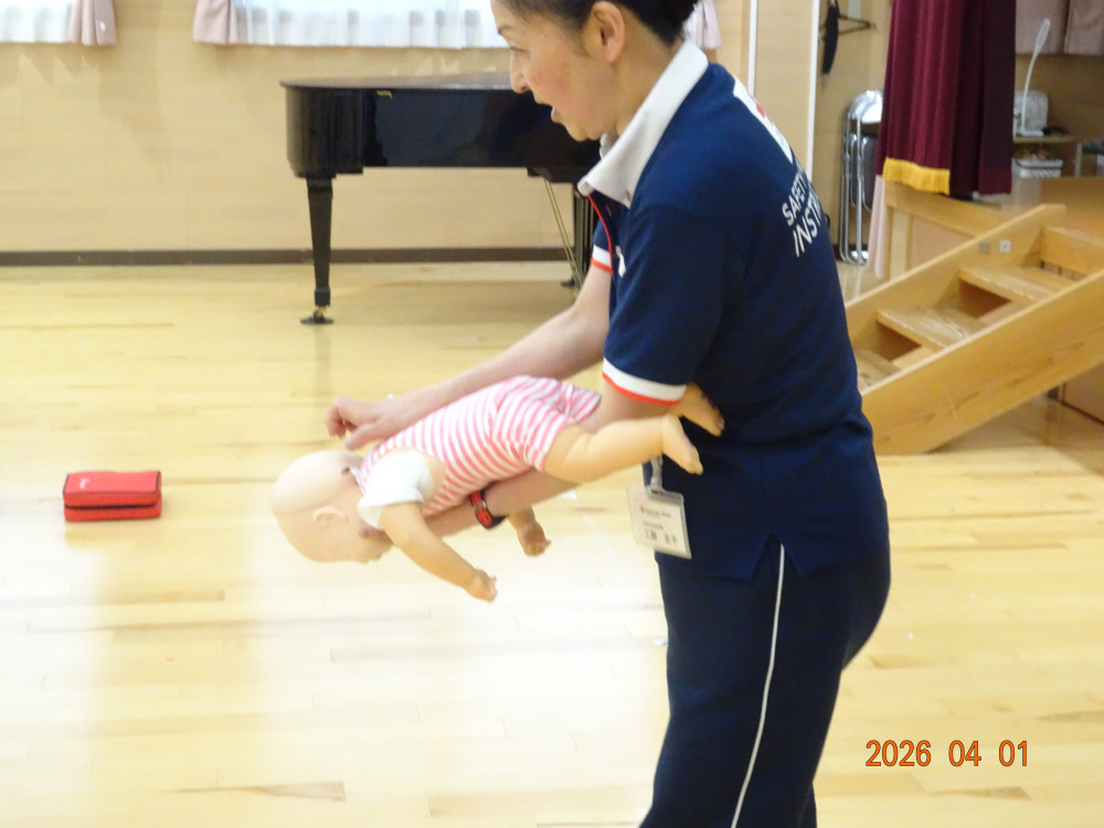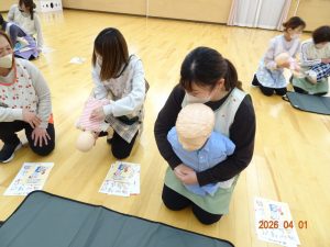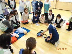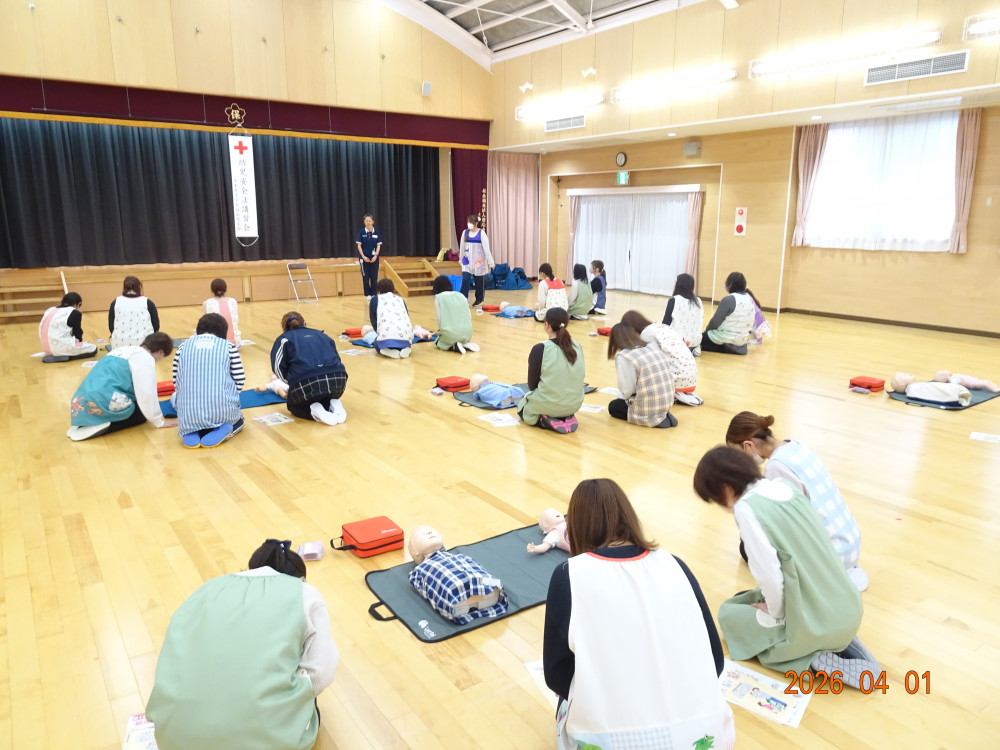 令和8年4月1日(水)午後より、日本赤十字社福島県支部の幼児安全法講習会の先生をお招きして、さくら保育園職員に応急手当(気道異物除去、心肺蘇生法、AED)の実技講習会を開催していただきました。